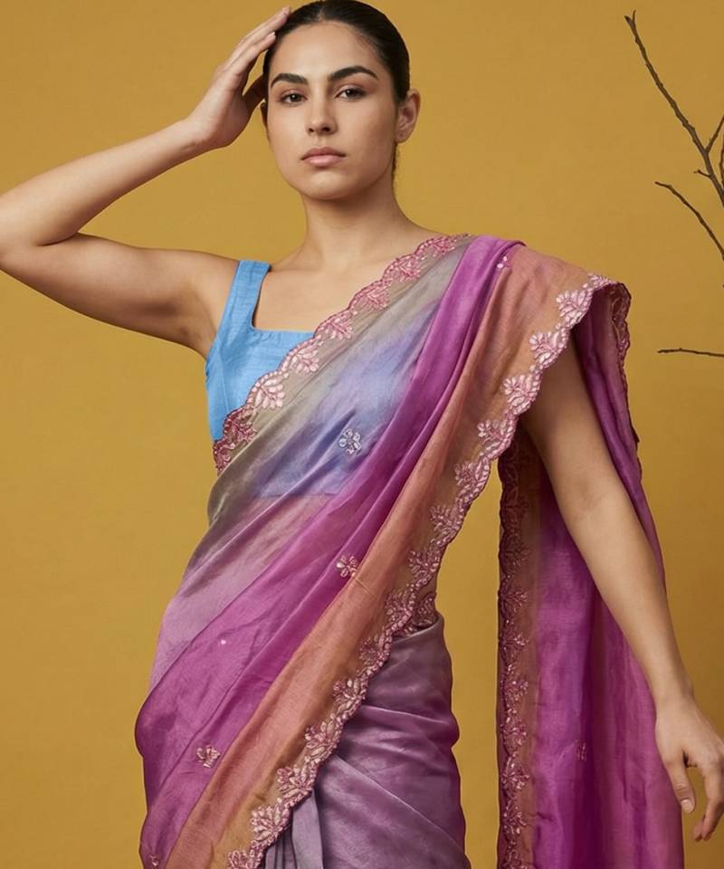 Lavender ombre zari embroidery border work organza silk