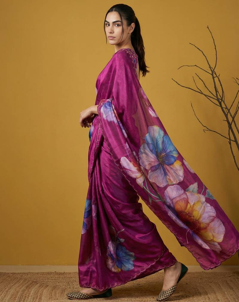Magenta multicolor floral print digital print work silk blend