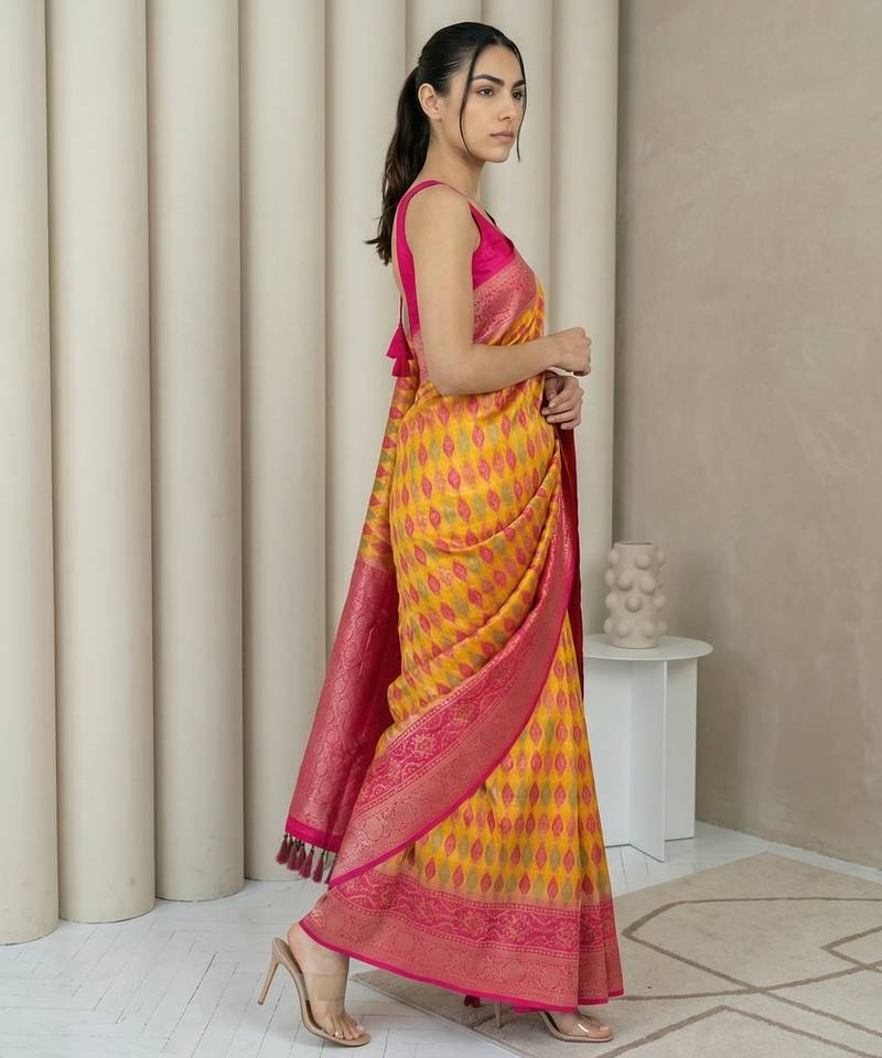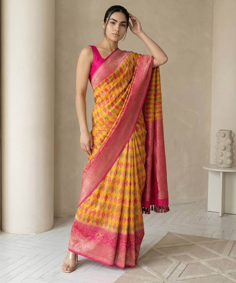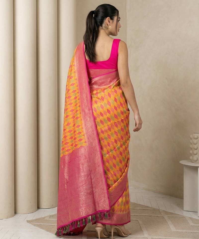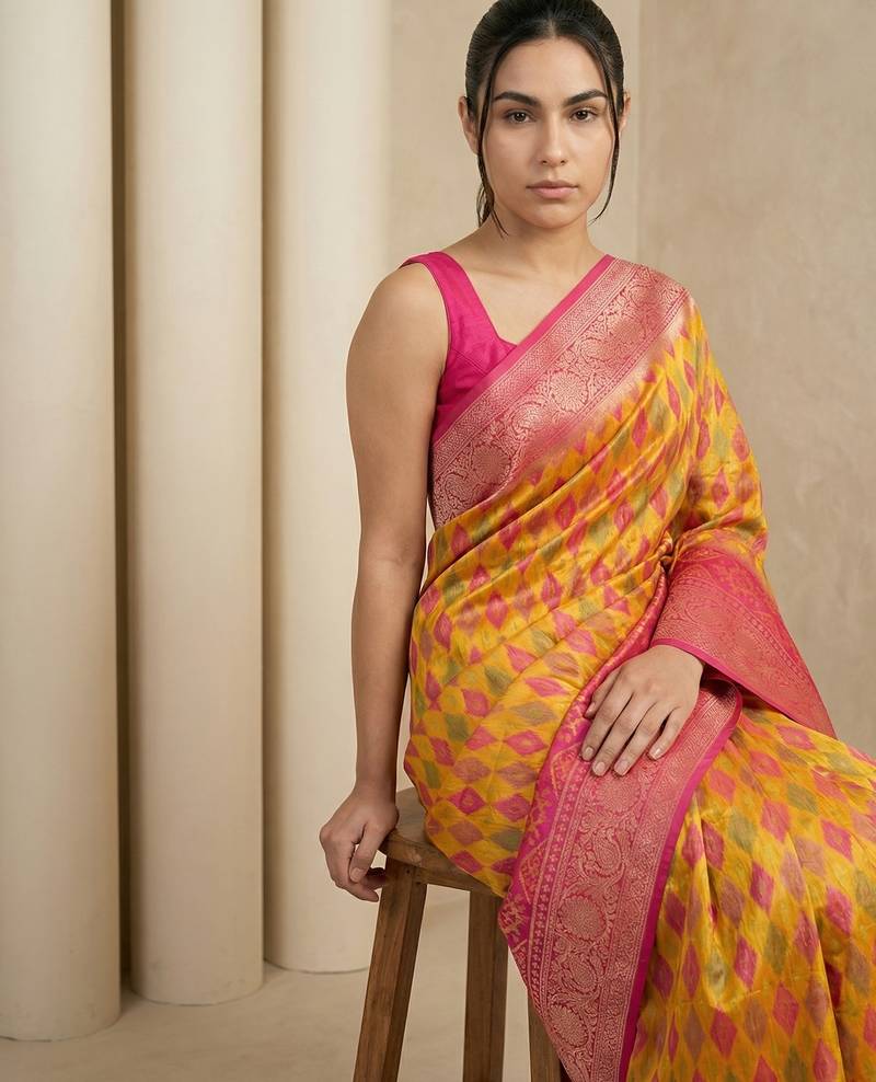 | Product Name | Mustard Geometric Diamond Weave Pattern Rich Zari Woven Border & Pallu Silk Blend Fabric | |