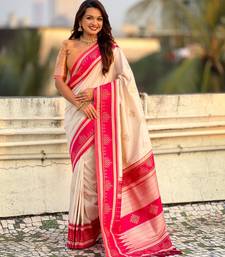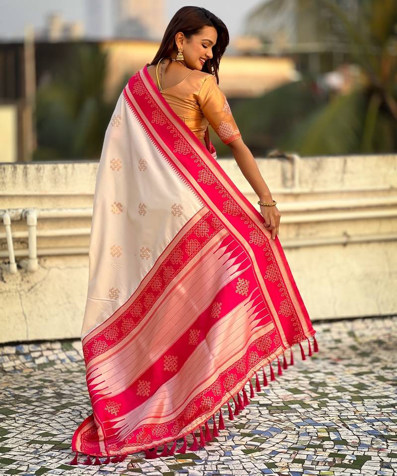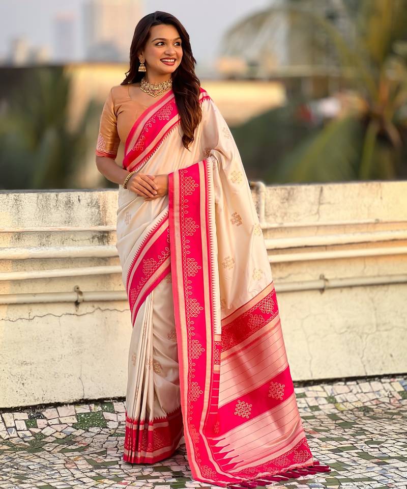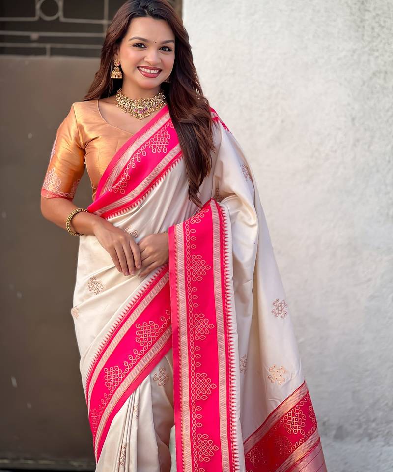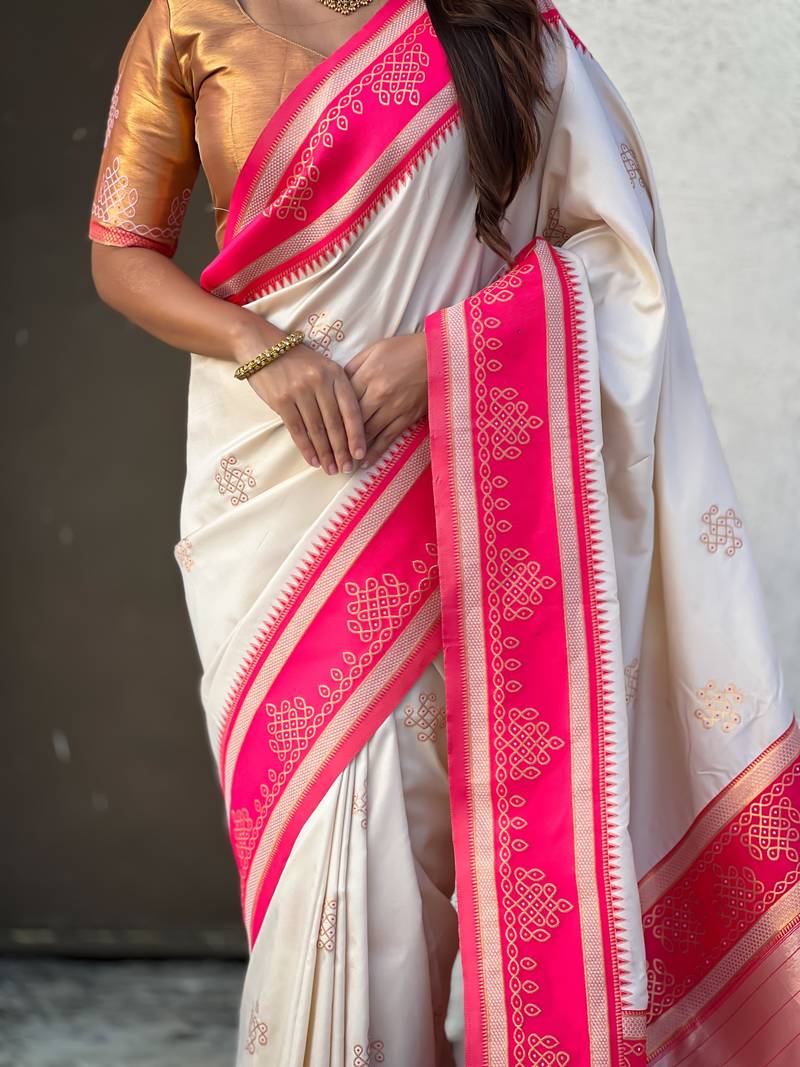Off white border traditional butti & geometric zari work rich woven pallu design