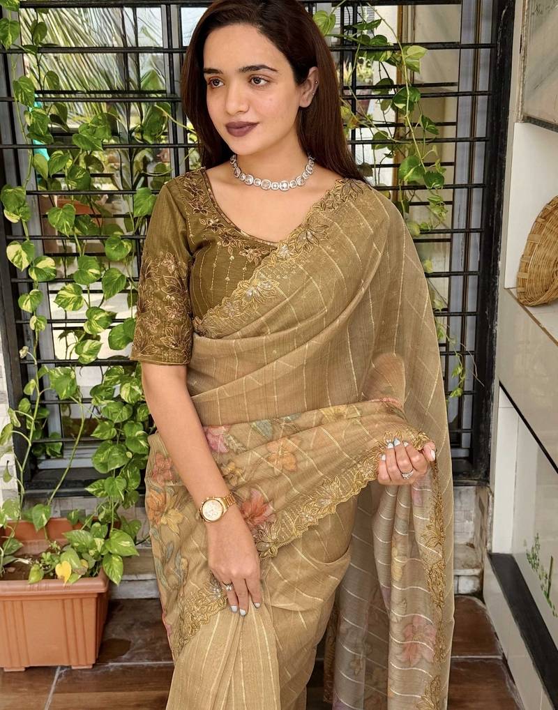 Olive organza zari weaving embroiderd saree with embroiderd blouse piece