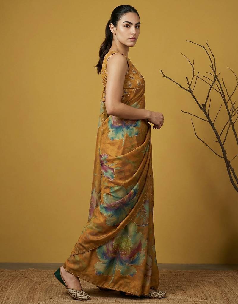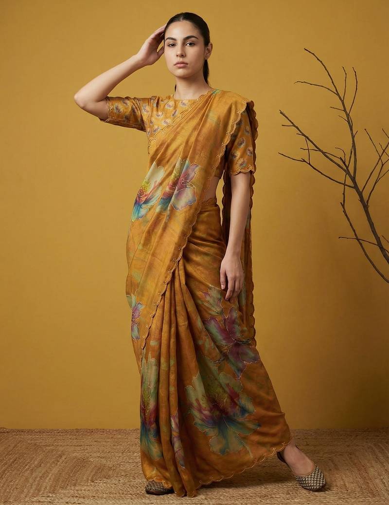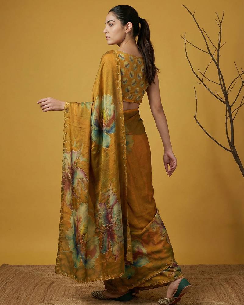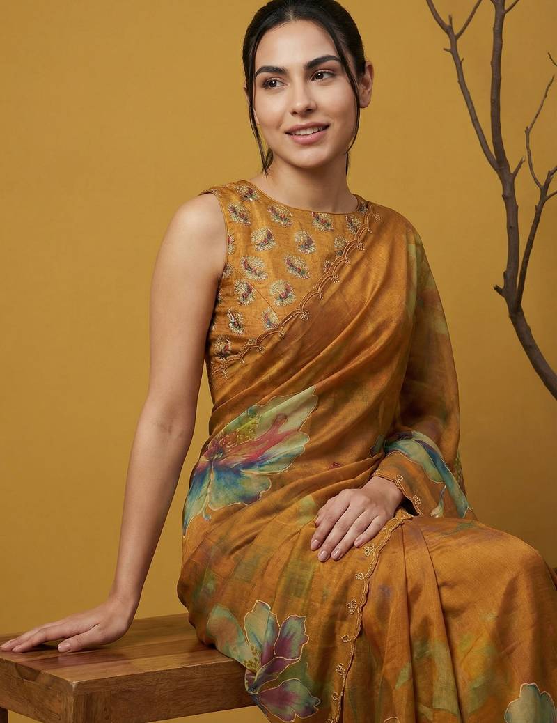 | Product Description | This Elegant Saree Is Crafted From Lightweight Organza Fabric, Offering A Sheer Texture With A Smooth And Graceful Drape. It Features Bold Multicolor Floral Digital Prints Across The Saree, Creating A Striking And Artistic Appeal. The Subtle Embroidered Border Adds A Refined Touch, Enhancing Its Overall Sophistication. Perfect For Evening Parties, Festive Occasions, And Special Events, This Saree Blends Modern Style With Ethnic Charm. Paired With A Matching Blouse Piece, It Creates A Stylish And Eye Catching Traditional Ensemble. |