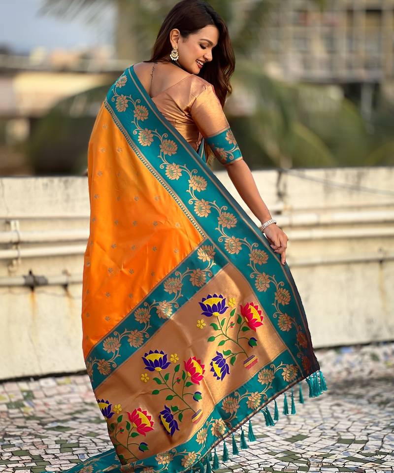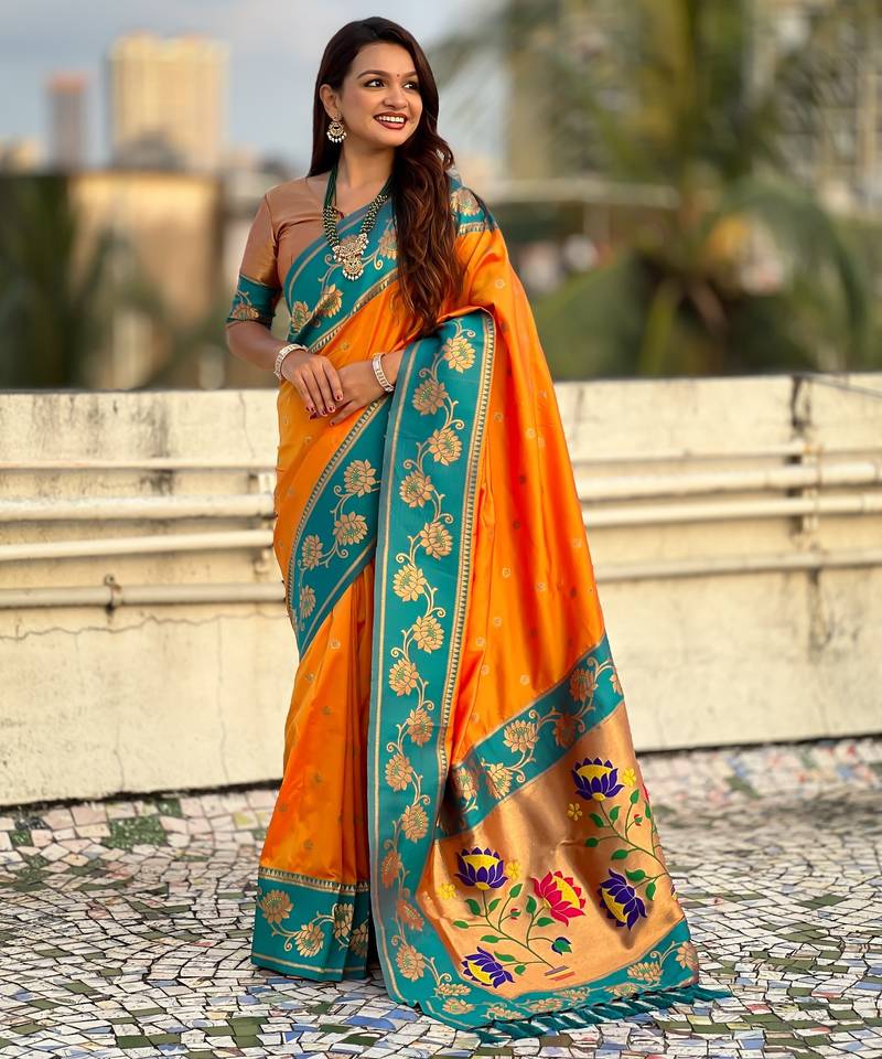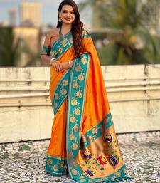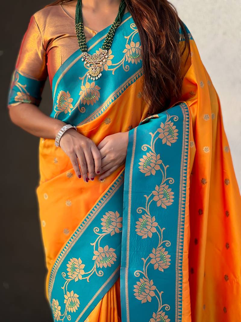 Orange soft silk zari weaving saree with contrast blouse piece