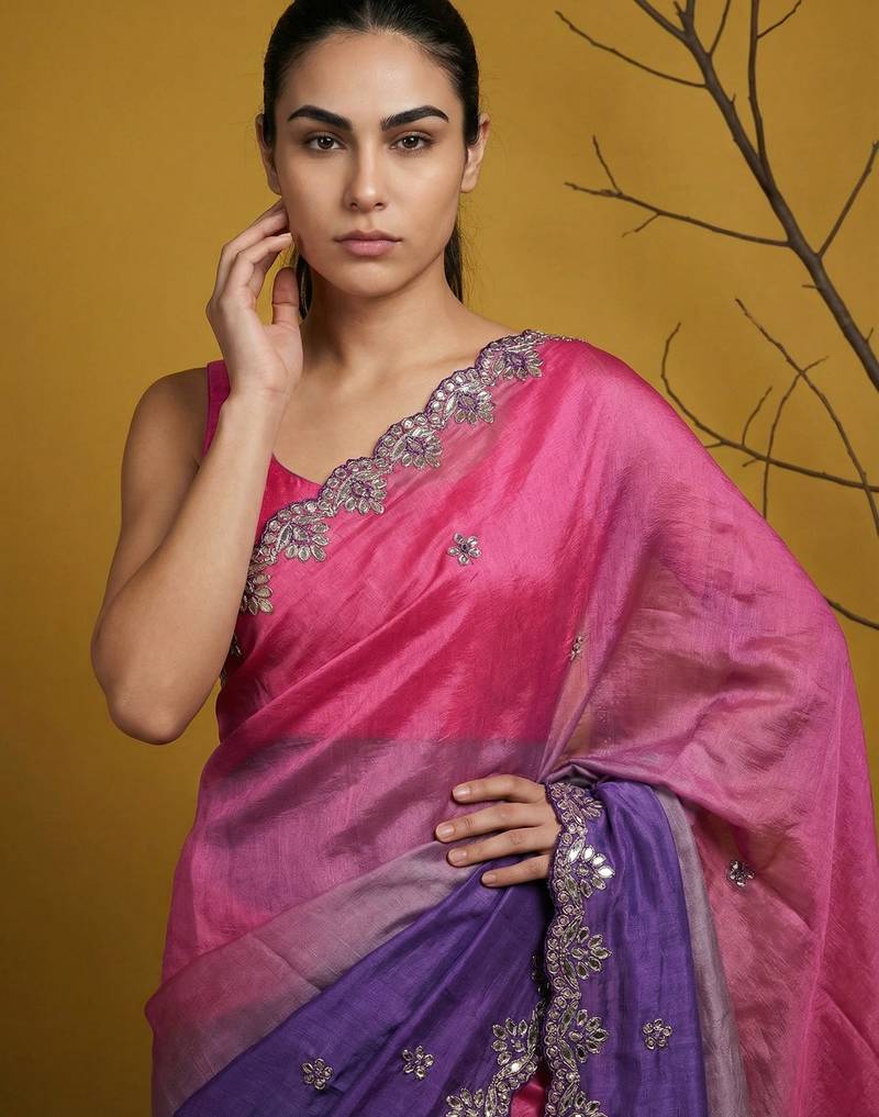 Peach ombre zari embroidery border work organza silk party
