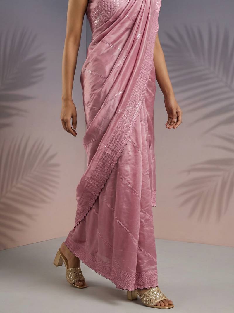 This Elegant Saree Is Crafted From Lightweight Organza Fabric, Offering A Sheer Texture With A Soft And Graceful Drape. It Features Subtle Self Design With Delicate Embroidered Detailing Along The Border, Adding A Refined And Sophisticated Touch. The Minimalistic Yet Classy Design Makes It Perfect For Festive Occasions, Parties, And Elegant Gatherings. Its Soft Pastel Tone Enhances Its Modern And Graceful Appeal. Paired With A Matching Blouse Piece, This Saree Creates A Chic And Timeless Ethnic Look.
