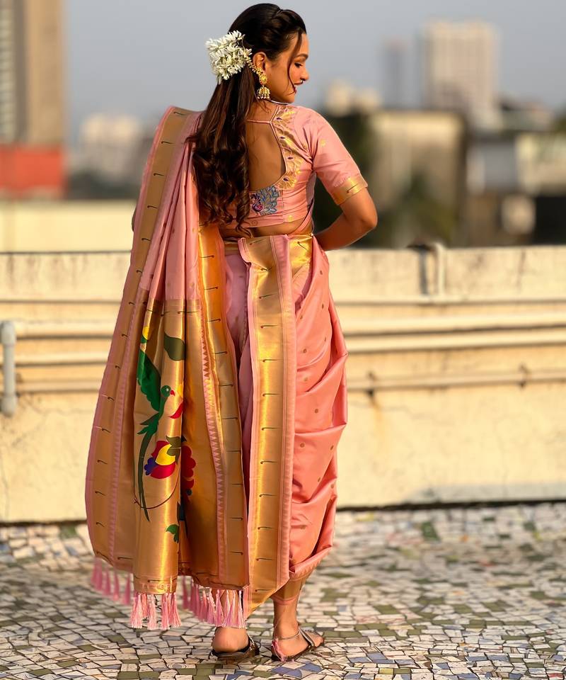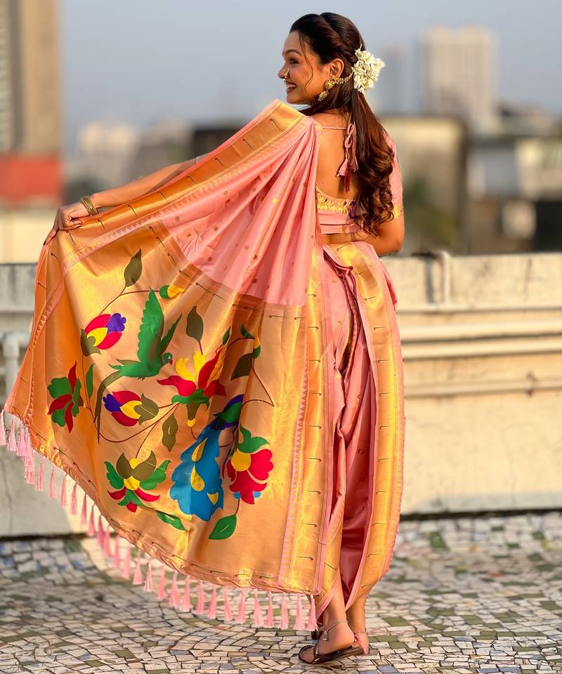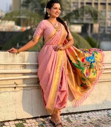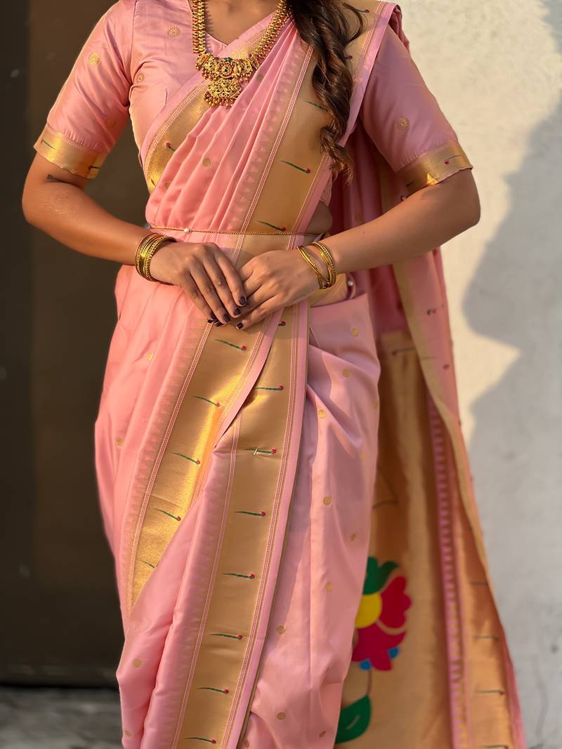 Pink soft silk paithani nauvari zari weaving saree with matching blouse piece