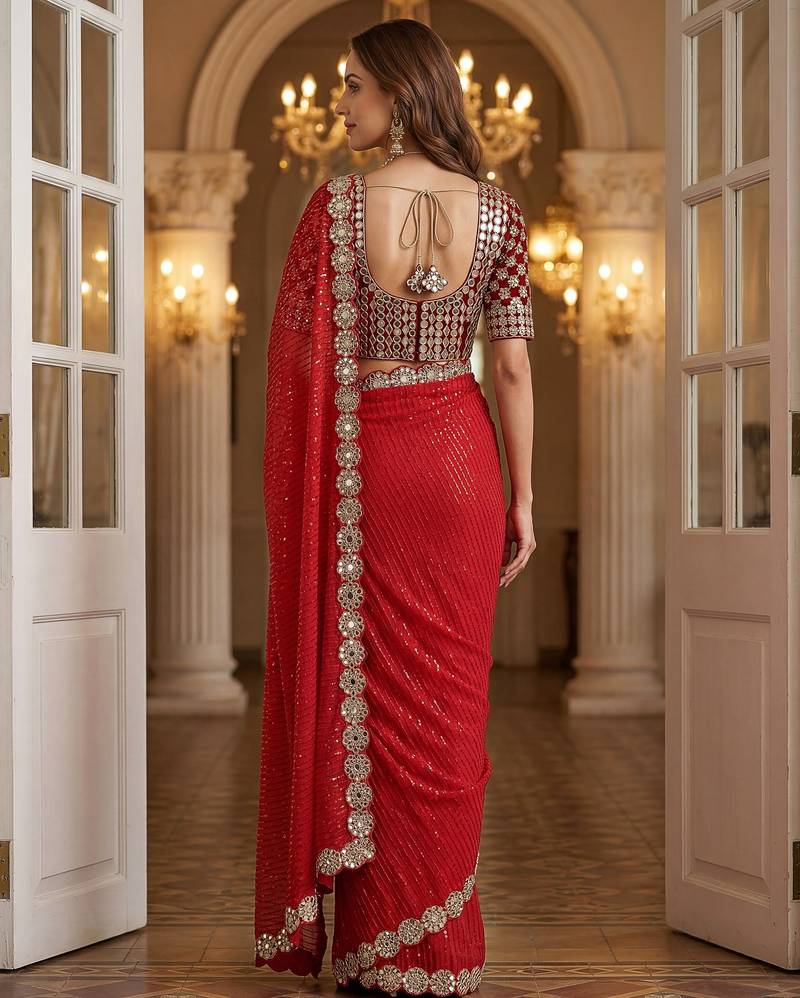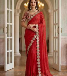 Red faux georgette embroiderd sequence work saree with matching blouse piece