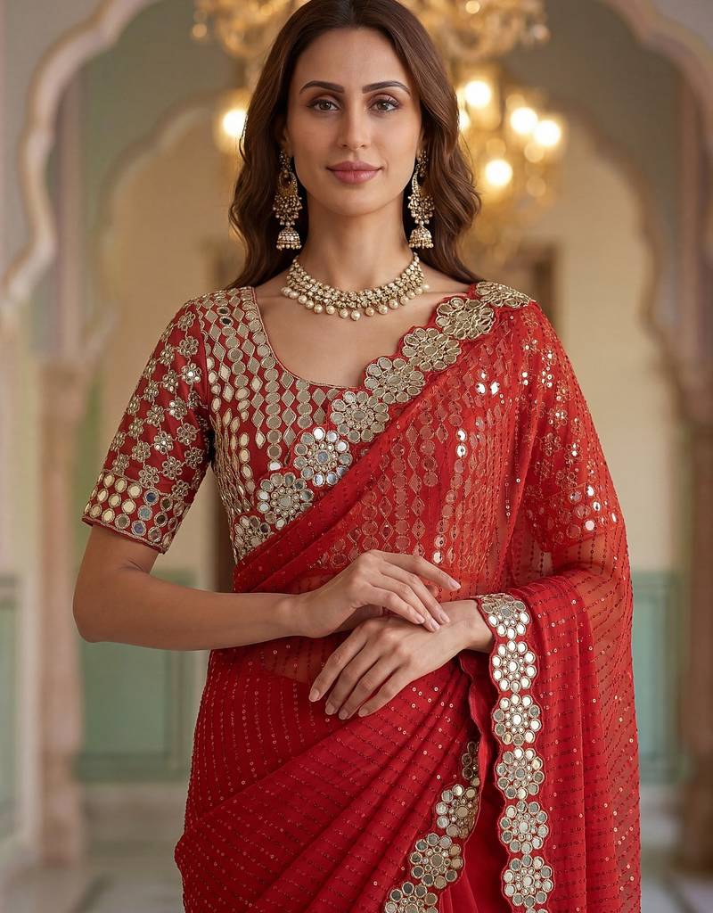 | Product Name | Red Faux Georgette Embroiderd Sequence Work Saree With Matching Blouse Piece | |