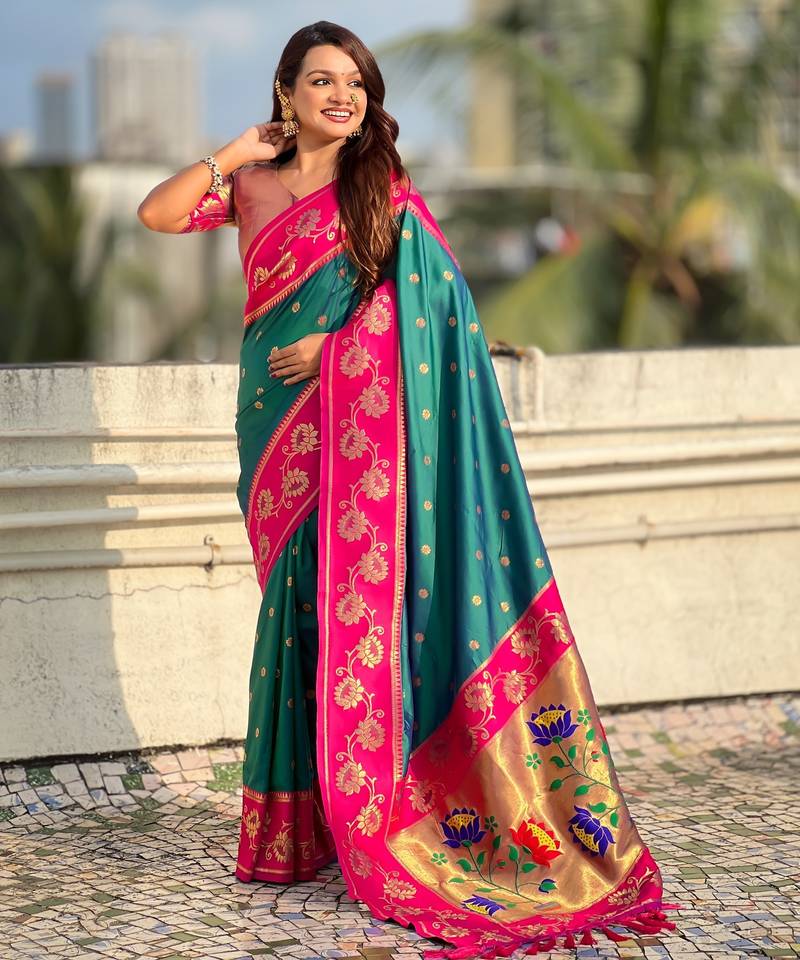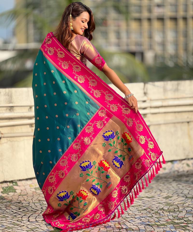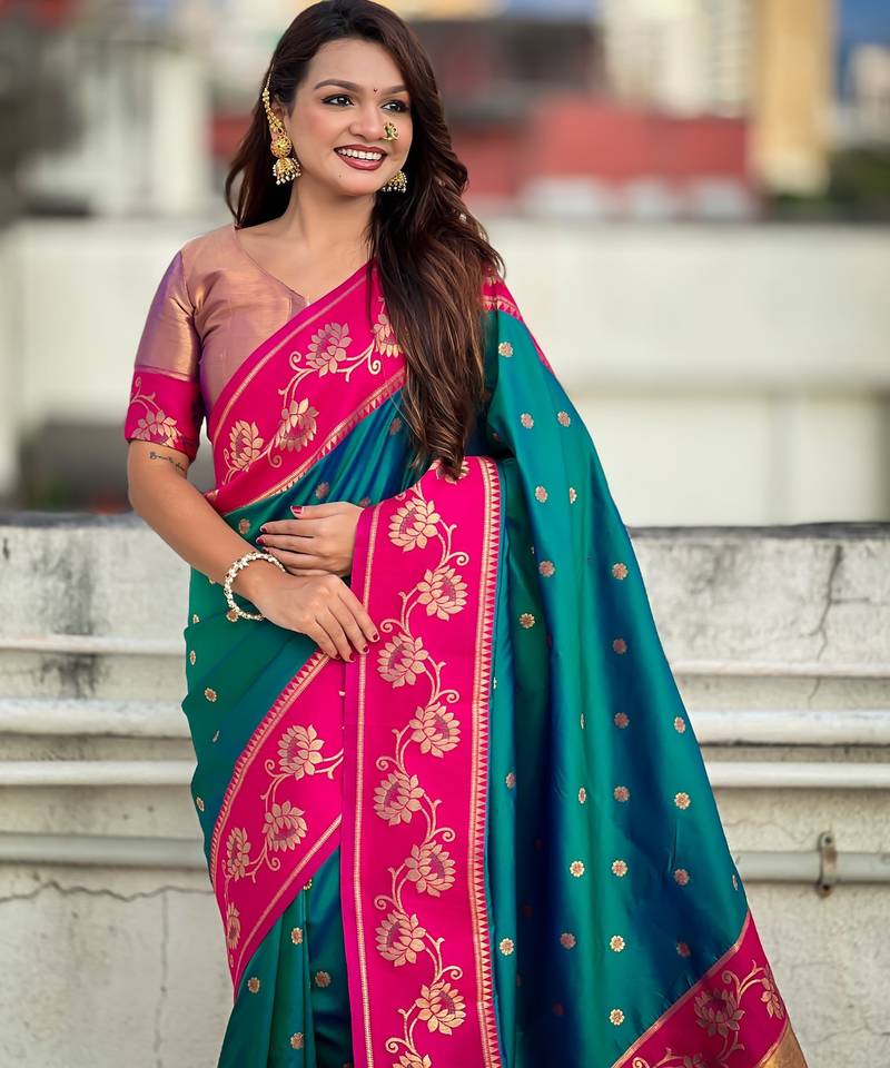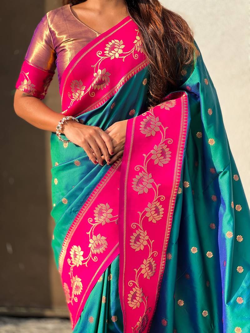 Teal soft silk zari weaving saree with contrast blouse piece