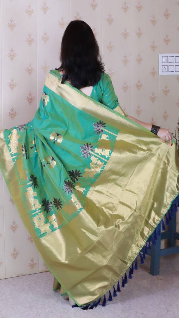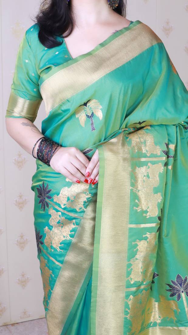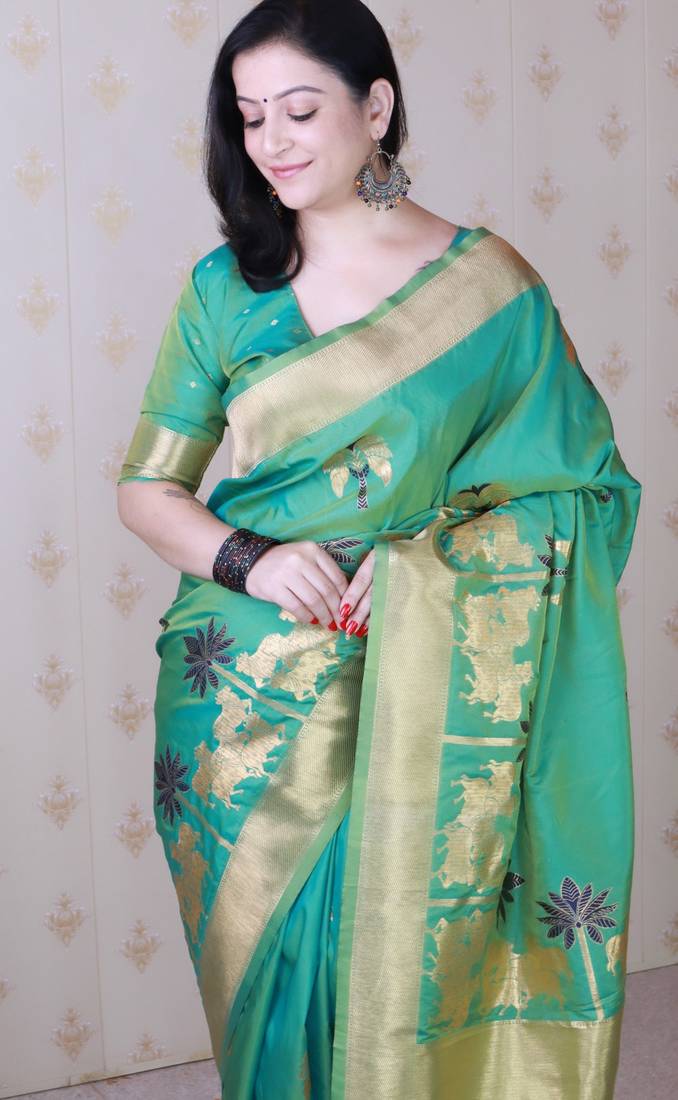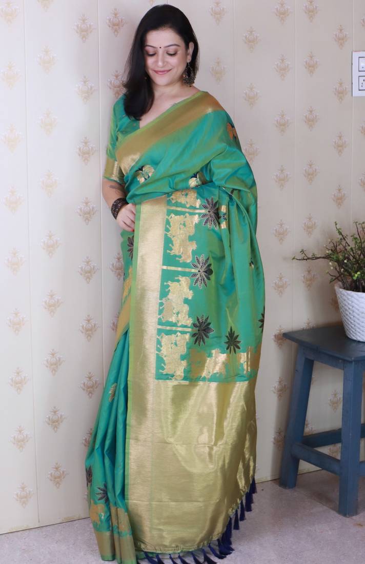Teal soft silk zari weaving saree with matching blouse piece