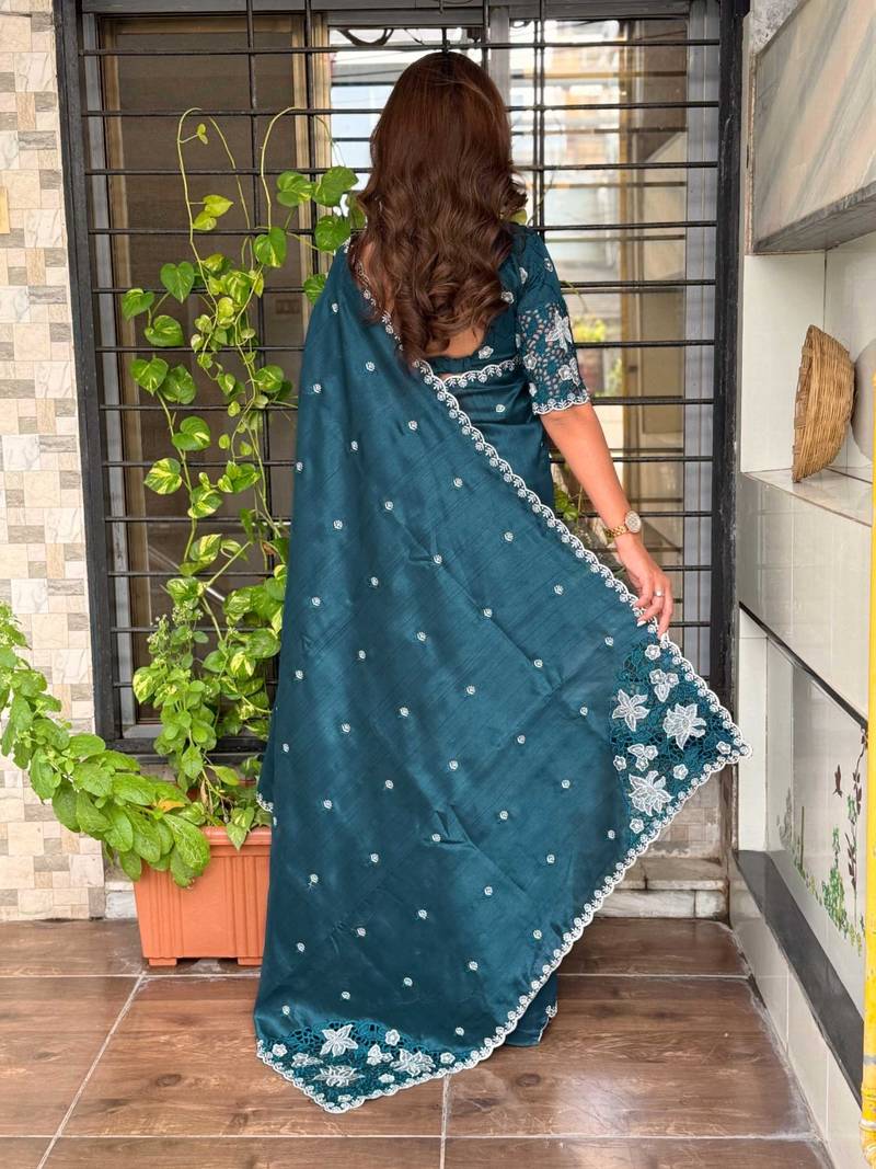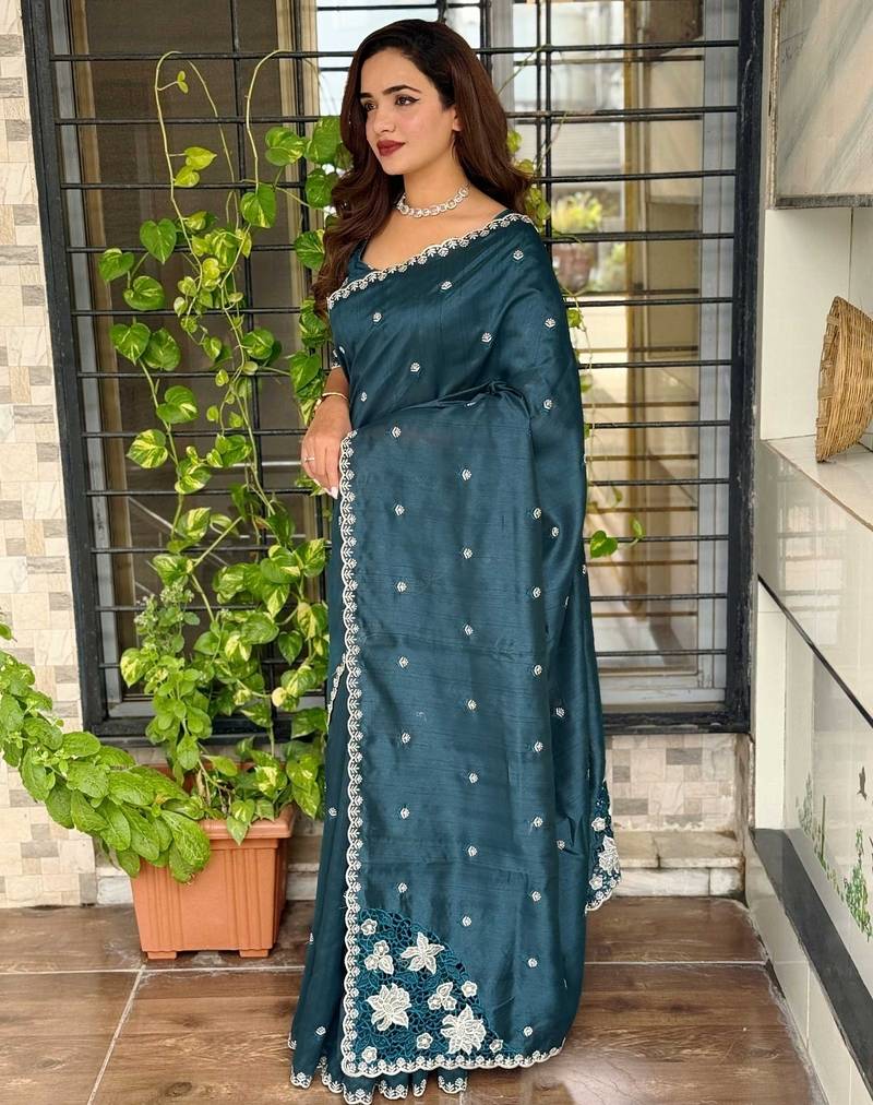Teal tussar cotton embroidery work saree with matching blouse piece