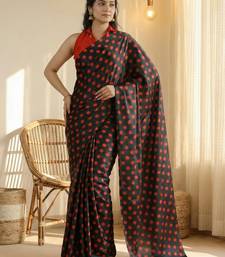 Black & red color polka dots printed japan satin saree with unstitched blouse