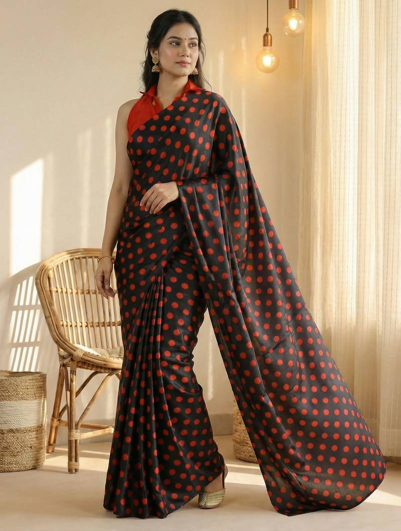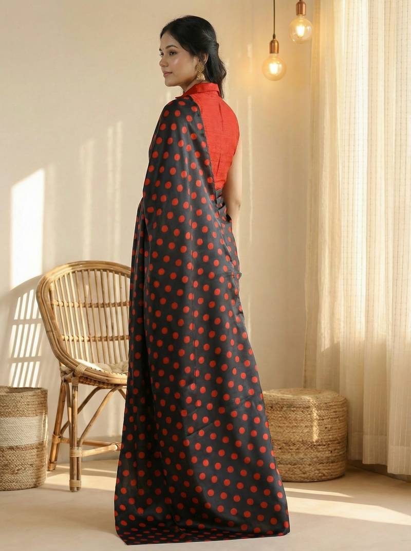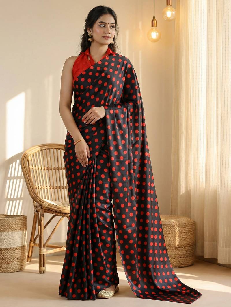 | Product Name | Black & Red Color Polka Dots Printed Japan Satin Saree With Unstitched Blouse | |