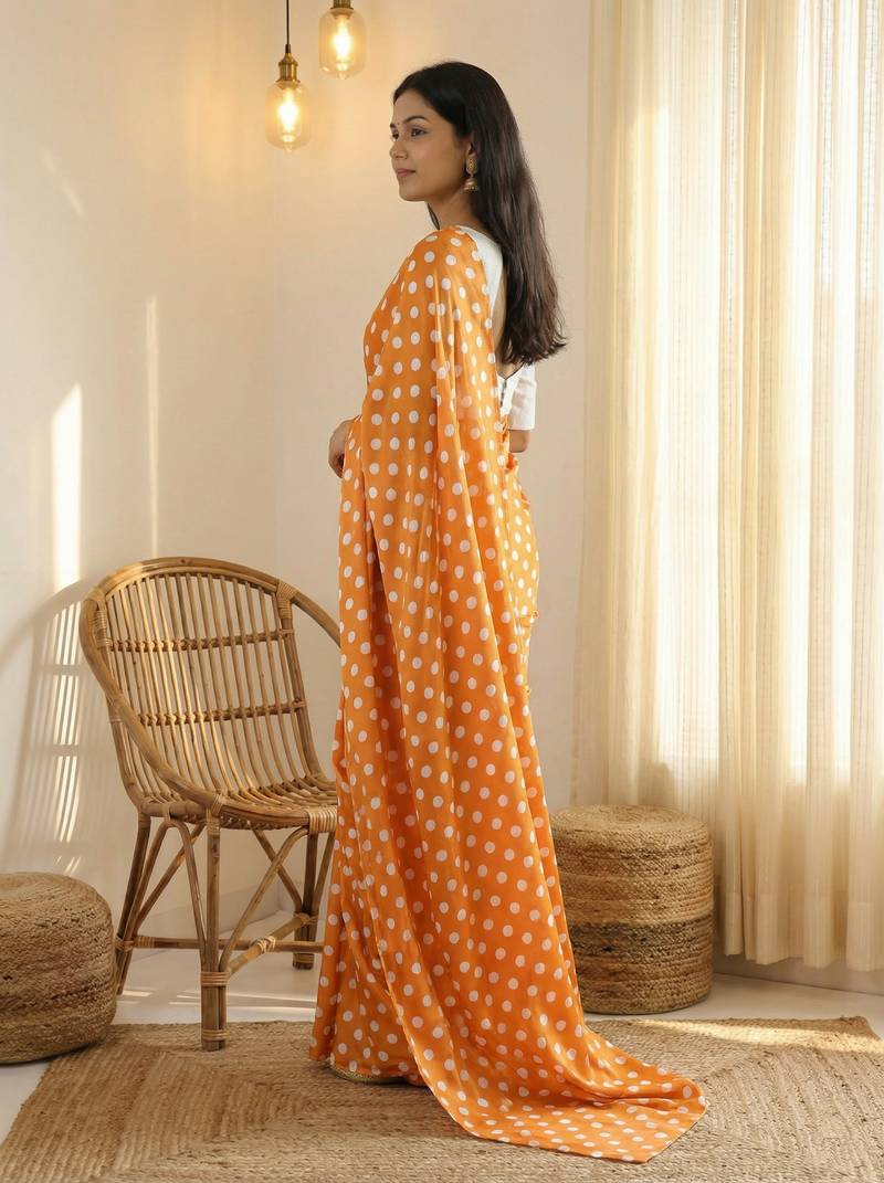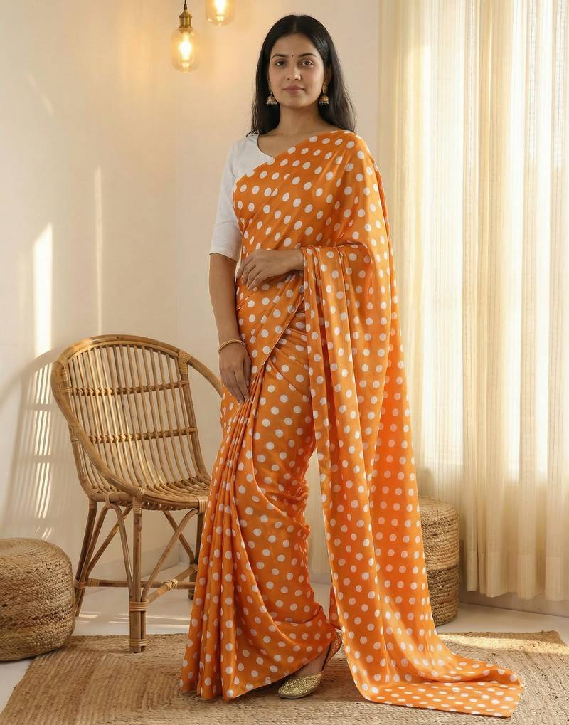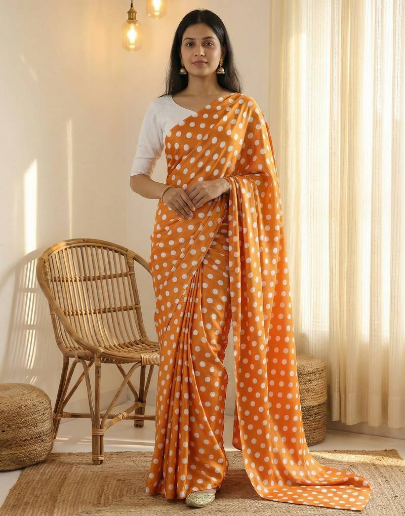 | Product Name | Orange & White Color Polka Dots Printed Japan Satin Saree With Unstitched Blouse | |