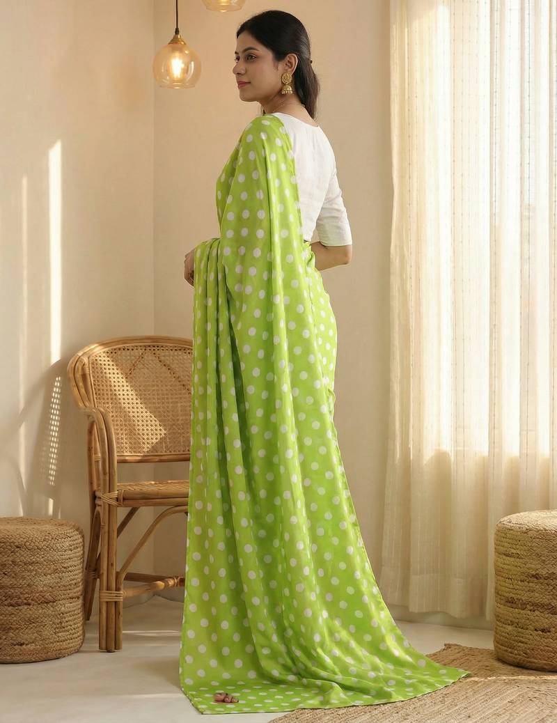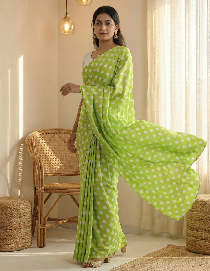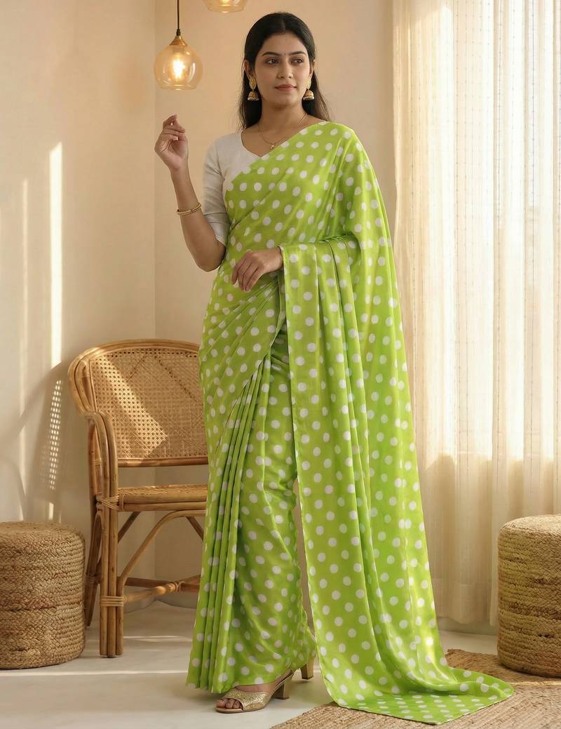 | Product Name | Parrot & White Color Polka Dots Printed Japan Satin Saree With Unstitched Blouse | |