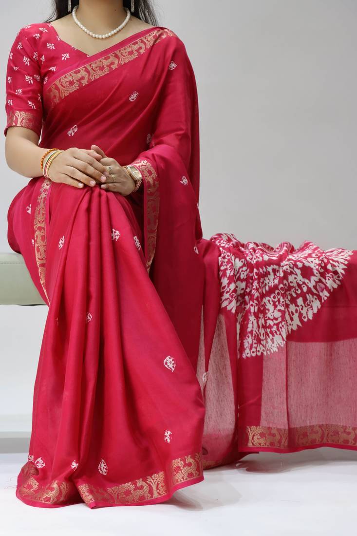 rani color shibori printed mull jacquard saree with unstitched blouse