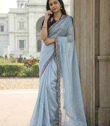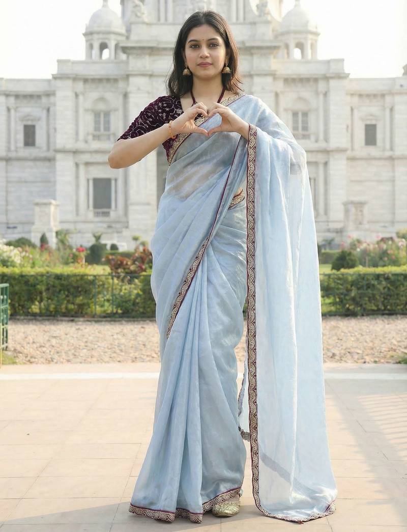 Sky color plain with contrast matching embroidered lace premium fendy silk saree with unstitched blouse