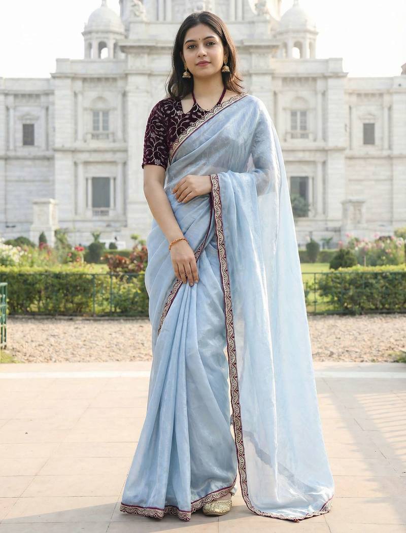 | Product Name | Sky Color Plain With Contrast Matching Embroidered Lace Premium Fendy Silk Saree With Unstitched Blouse | |