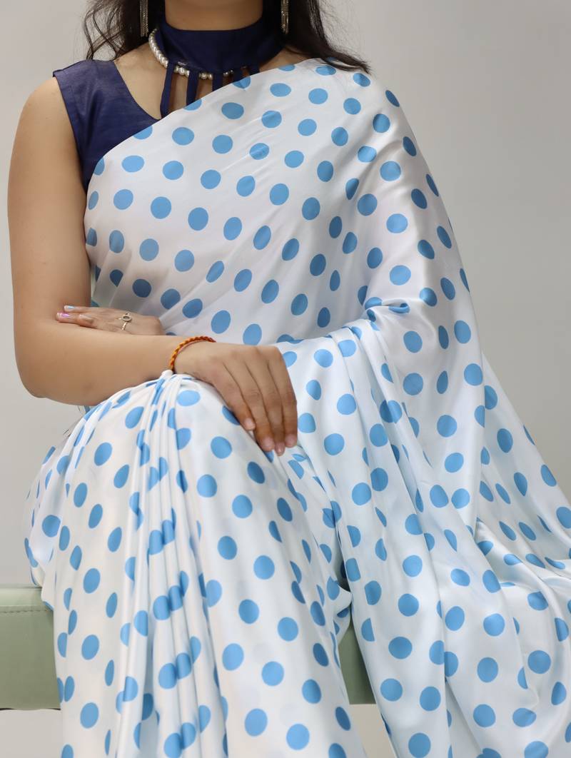 Sky color polka dots print heavy japan satin saree with unstitched blouse