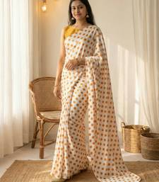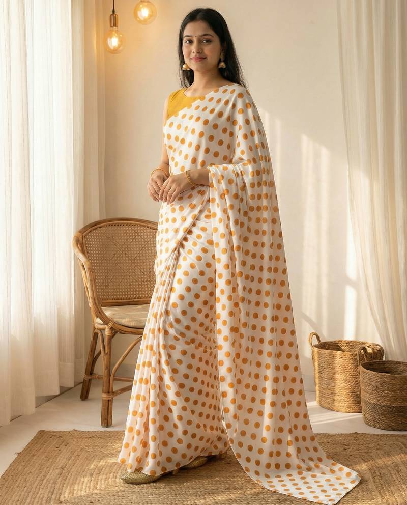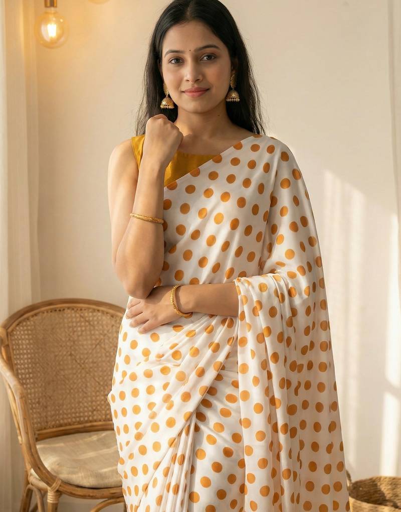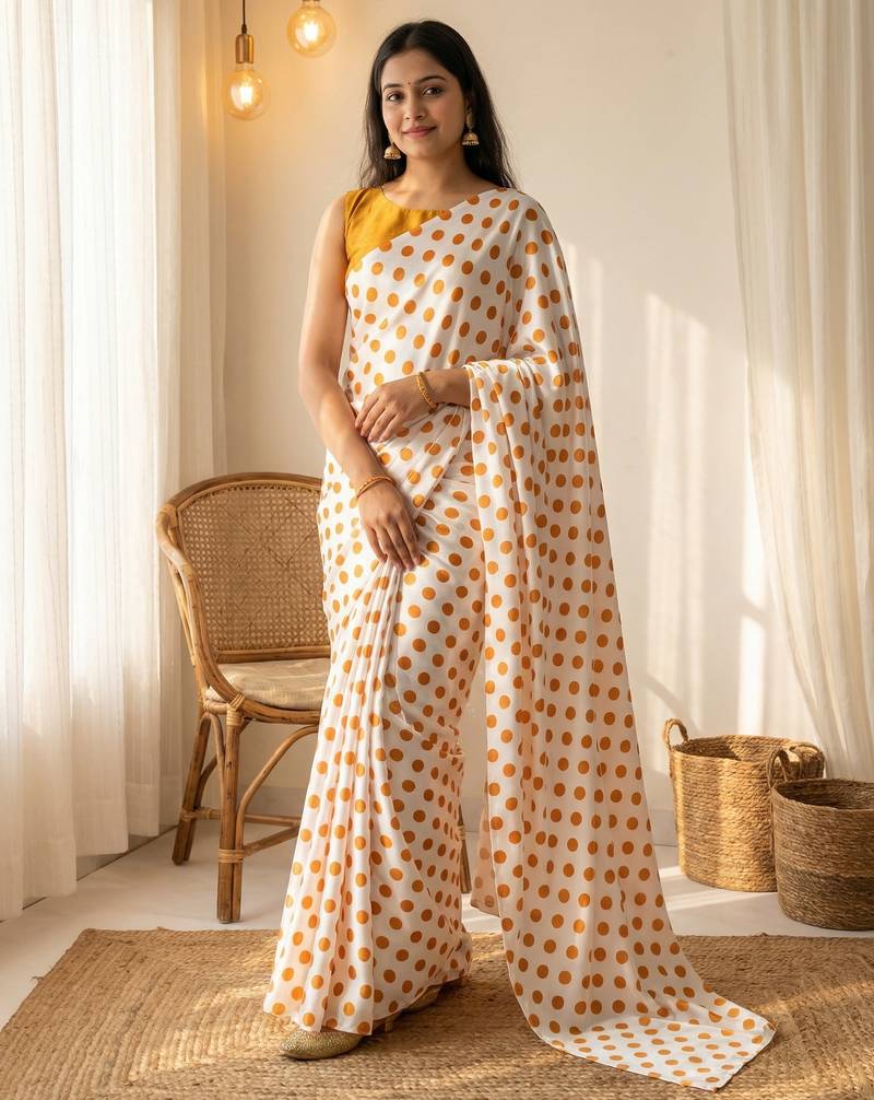 | Product Name | White & Orange Color Polka Dots Printed Japan Satin Saree With Unstitched Blouse | |