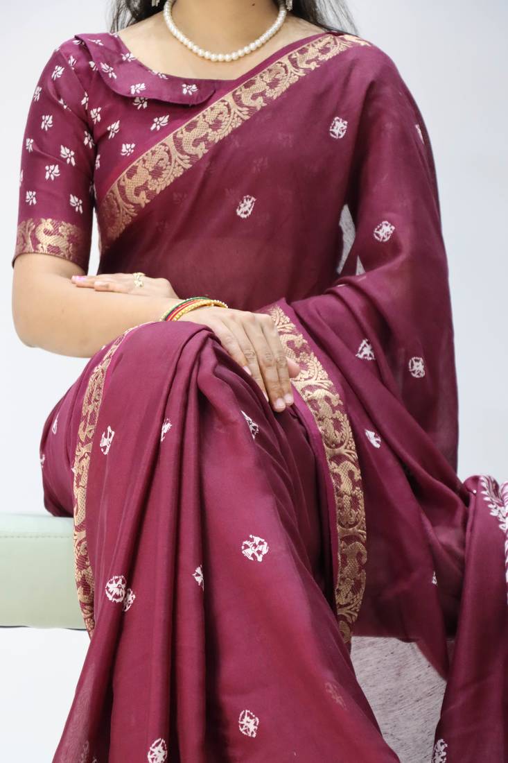 Product Name Wine Color Shibori Printed Mull Jacquard Saree With Unstitched Blouse