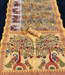 Yellow kalamkari printed shimmar saree with unstitched blouse