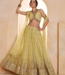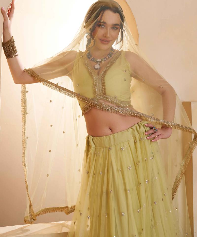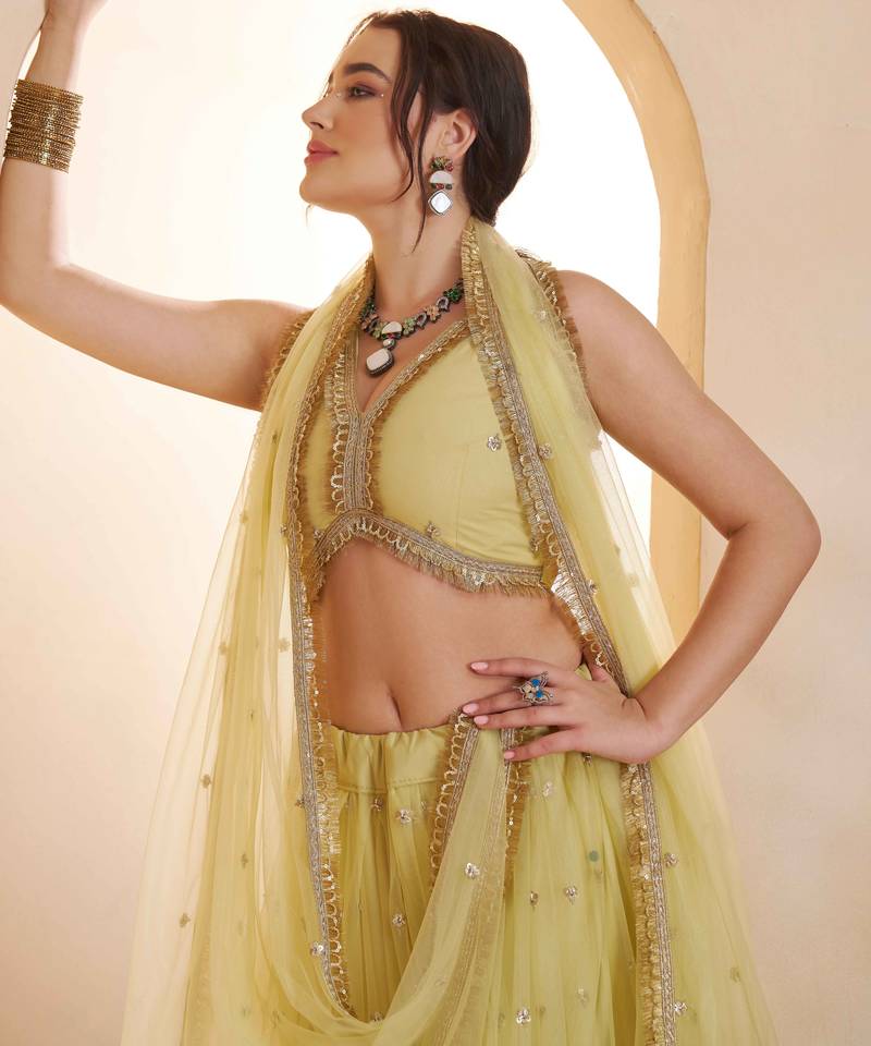 Lemon yellow net sequin embroidered lehenga set with choli and dupatta