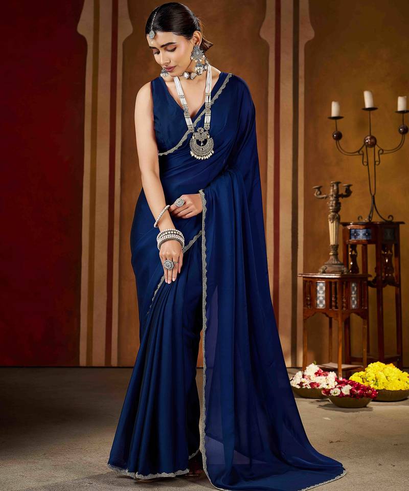 Party wear navy blue rangoli silk saree with fancy lace border