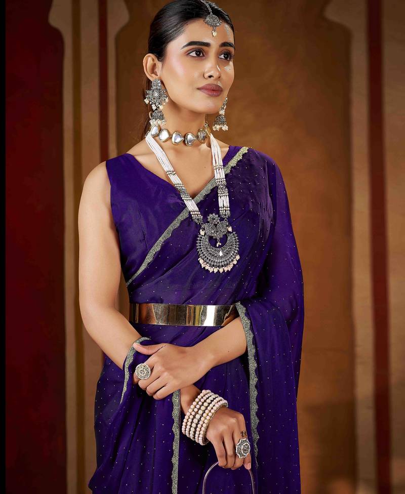 Premium violet rangoli silk saree with beads & lace detailing
