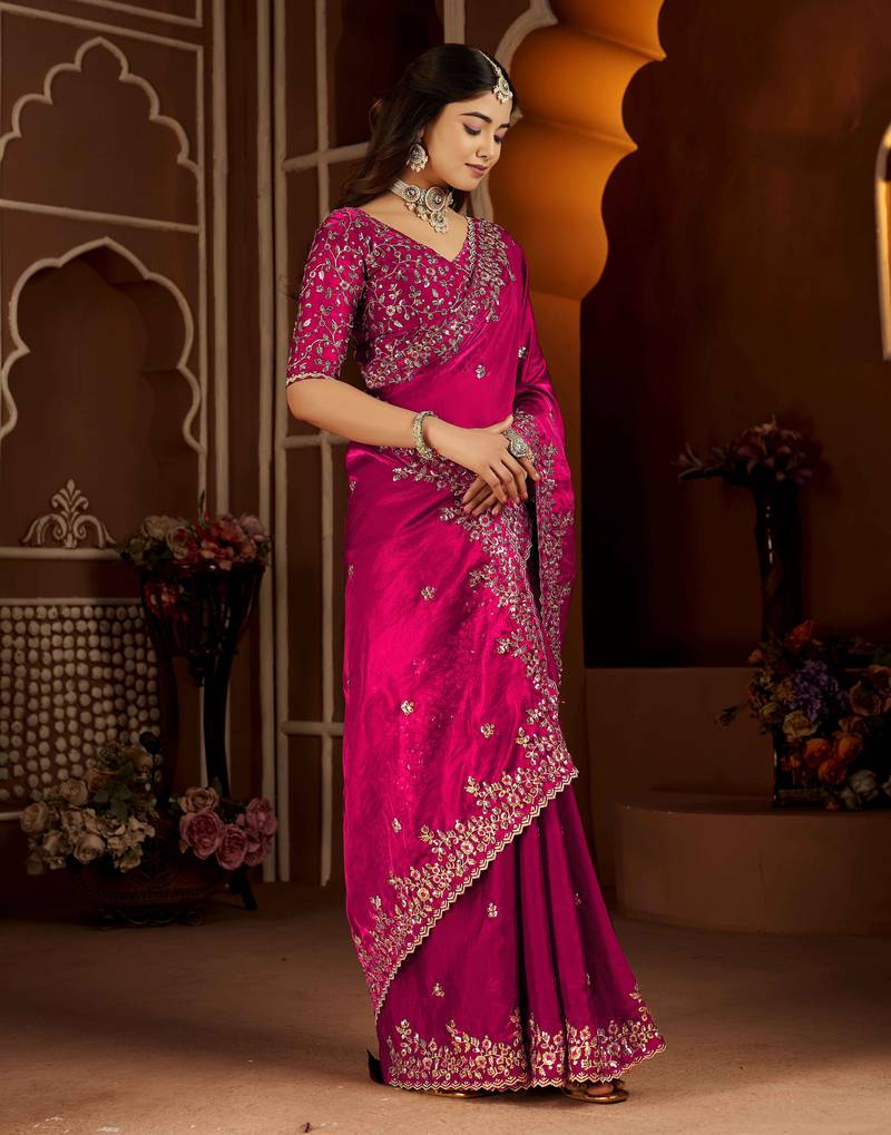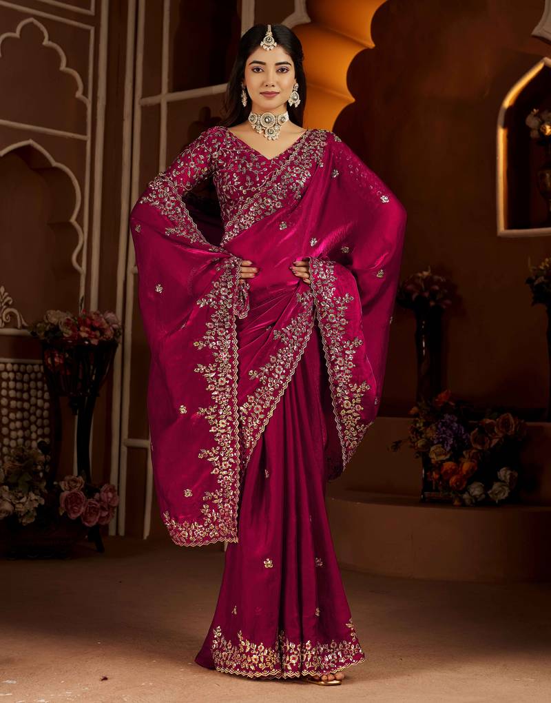 Rani color satin silk saree with heavy jari embroidery work & designer blouse