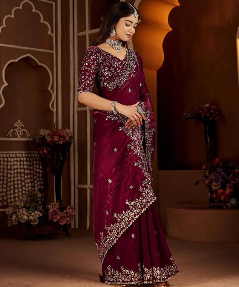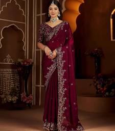 Wine color satin silk saree with heavy jari embroidery work & designer blouse