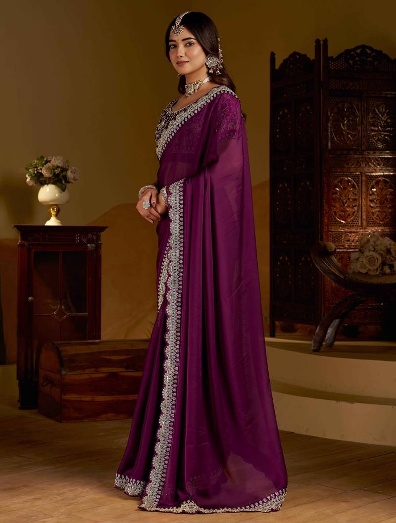 Elevate Your Ethnic Wardrobe With This Stunning Wine Rangoli Silk Saree Designed For Elegance And Grace. Crafted From Premium Quality Rangoli Silk Fabric, This Saree Features Intricate Embroidery Work With A Beautifully Detailed Border That Adds A Rich And Luxurious Touch. The Heavy Embroidered Blouse Enhances The Overall Royal Look, Making It Perfect For Weddings, Receptions, Festive Celebrations, And Party Wear Occasions.