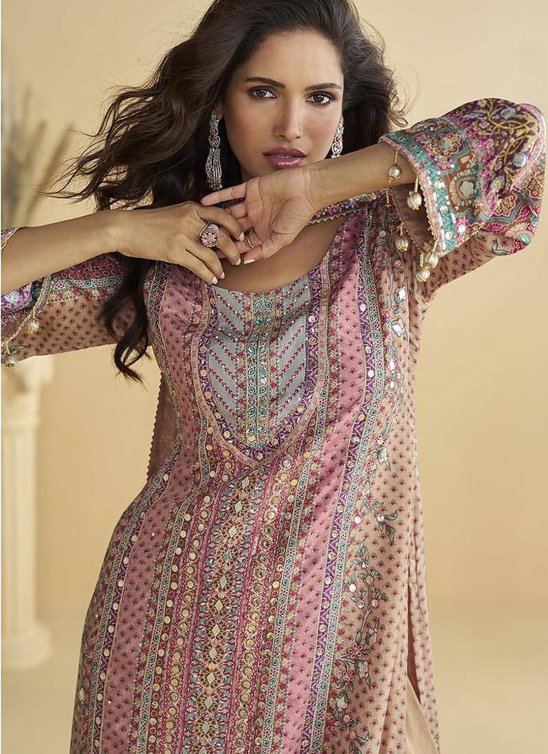 Beige crepe printed palazzo suit semi stitched