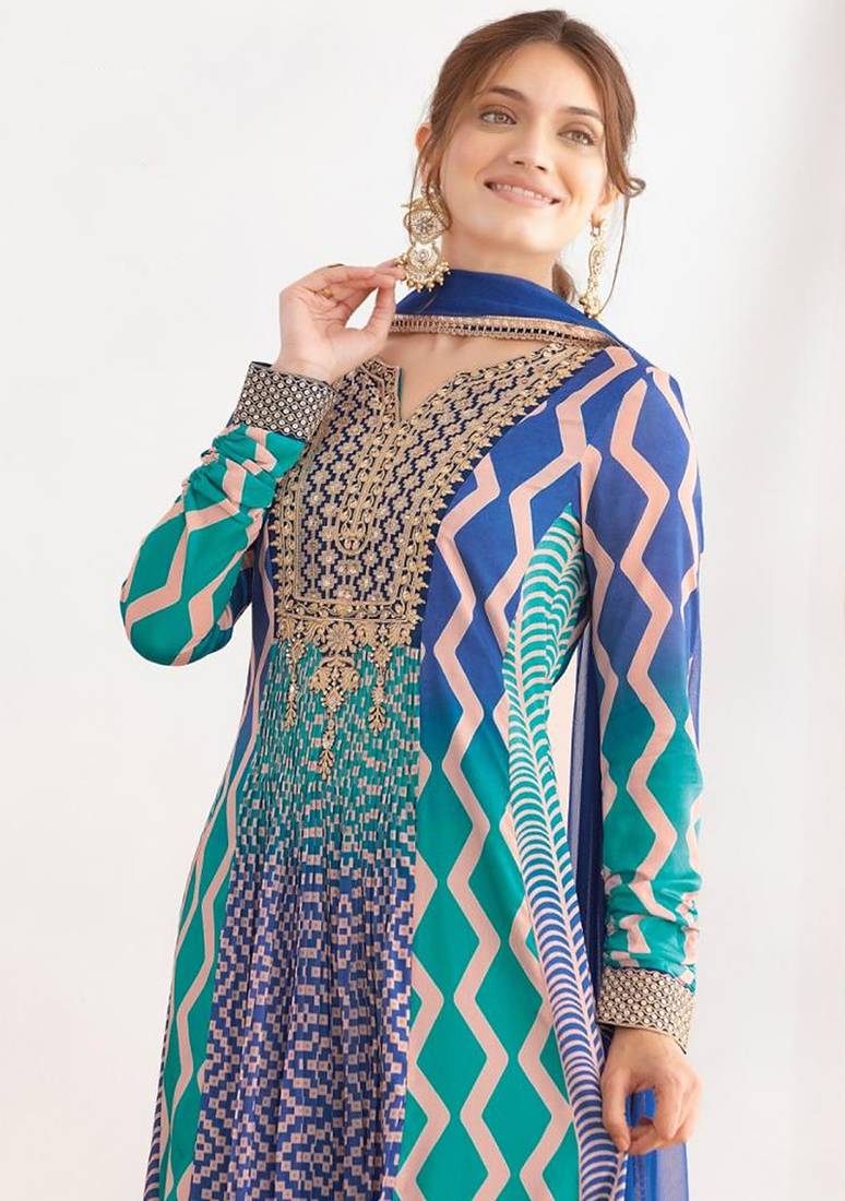 | Product Description | A Vibrant Blue And Turquoise Chinon Anarkali Top Set With Dabka Dori, Resham,Leheriyu Print Work, Styled With Chinon Dupatta. A Strong Color Pop Festive Option With Minimal Fuss. |