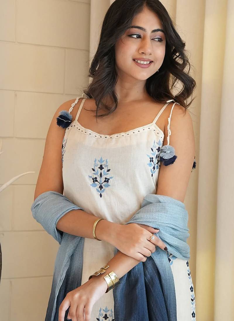 Cotton flex embroidered sttiched kurta set in off white stitched
