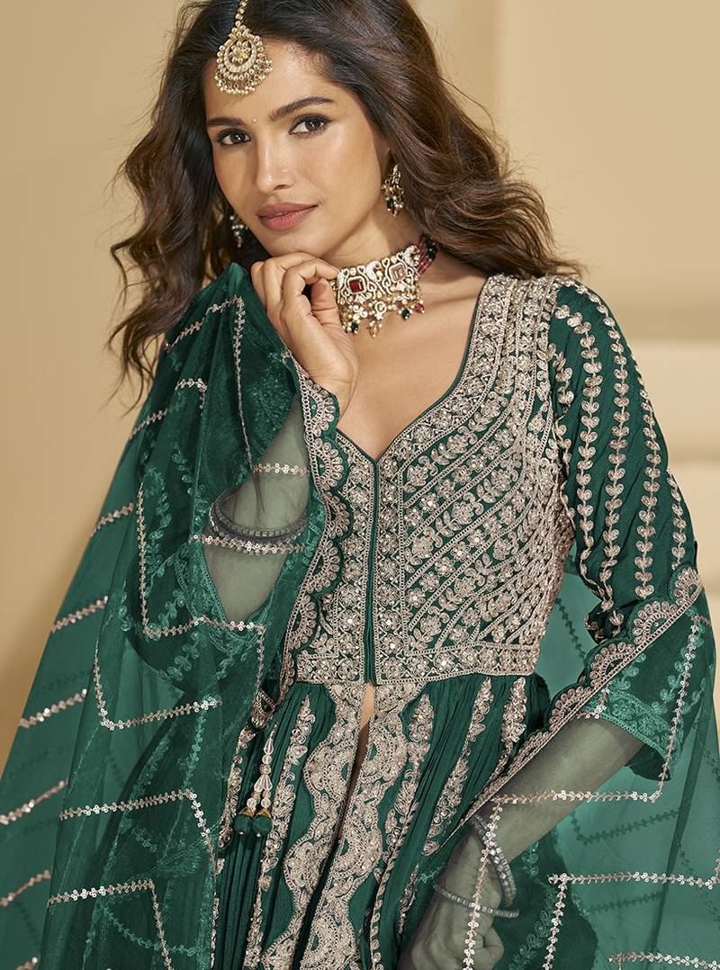 | Product Description | A Festive Dark Green Chinon Silk Anarkali Featuring Cut Dana And Embroidery. Styled With 3/4th Sleeves, Keyhole Neckline And A Drawstring Closure, Paired With Straight Palazzo And Dupatta”Ideal For Pooja And Festive Occasions.Note : This Suit Will Be Sttiched Free Size 42" |