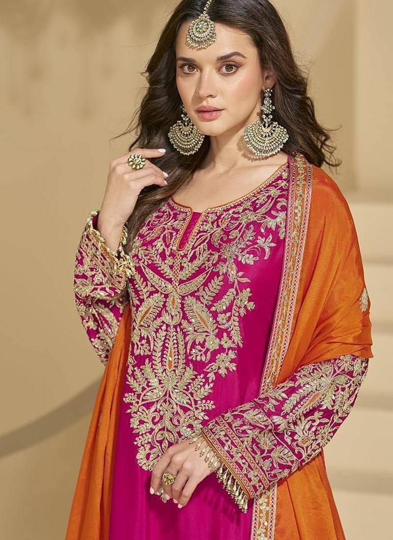 Dark pink color chinon palazzo suit semi stitched