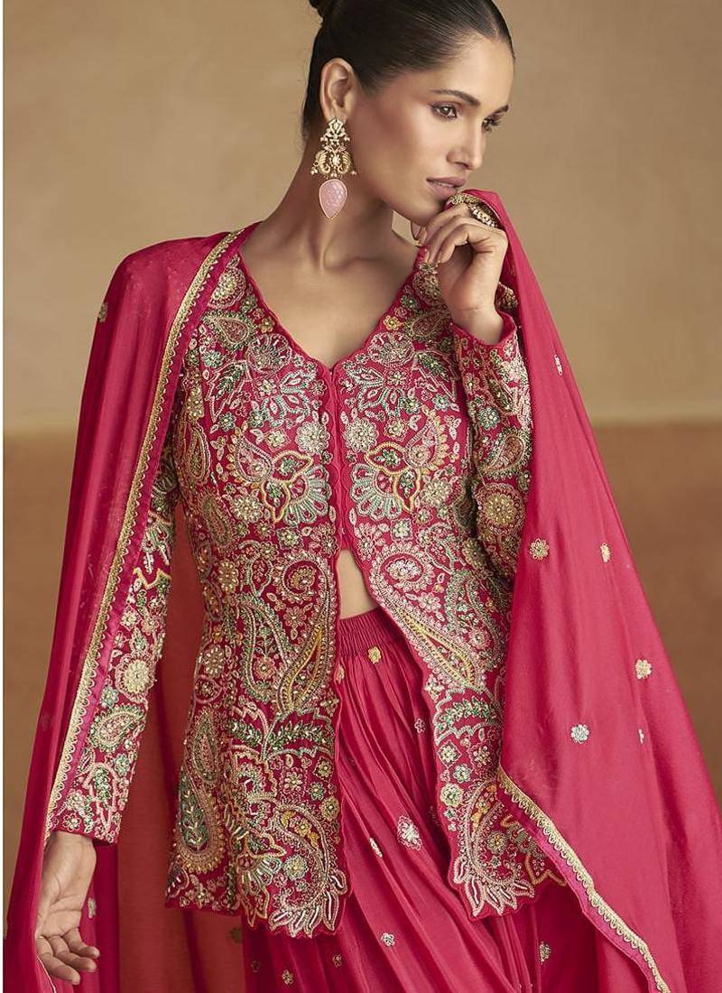 | Product Description | Designed In Luxurious Dark Pink Chinon Silk , This Festive Palazzo Set Features An Short Kurta Detailed With Zardosi And Thread Embroidery For A Refined Finish. Styled With A V Neckline And Full Sleeves, It Is Paired With Flared Palazzos And An Chinon Dupatta. |