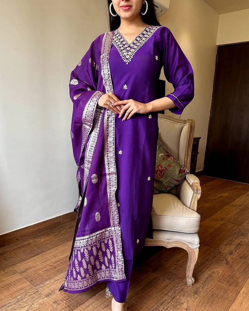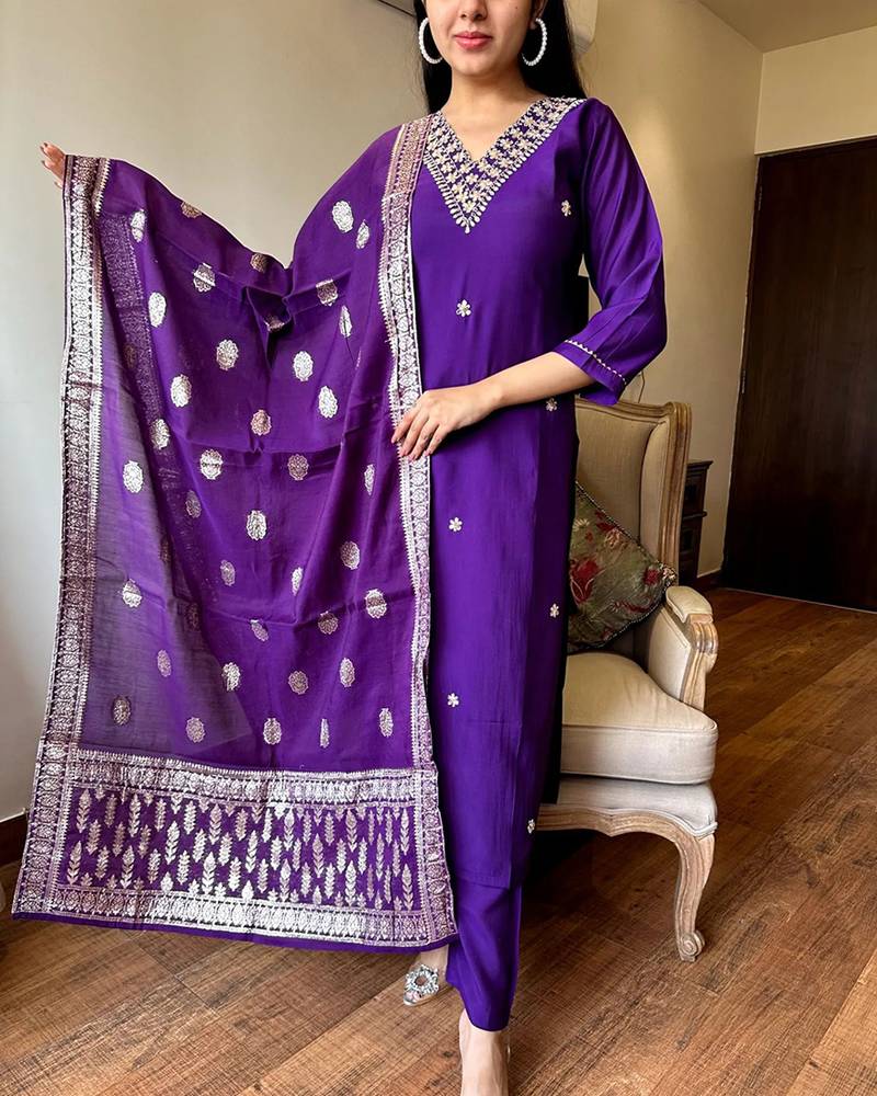 Product Name Dark Purple Chanderi Silk Embroidered Kurta Set
