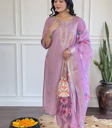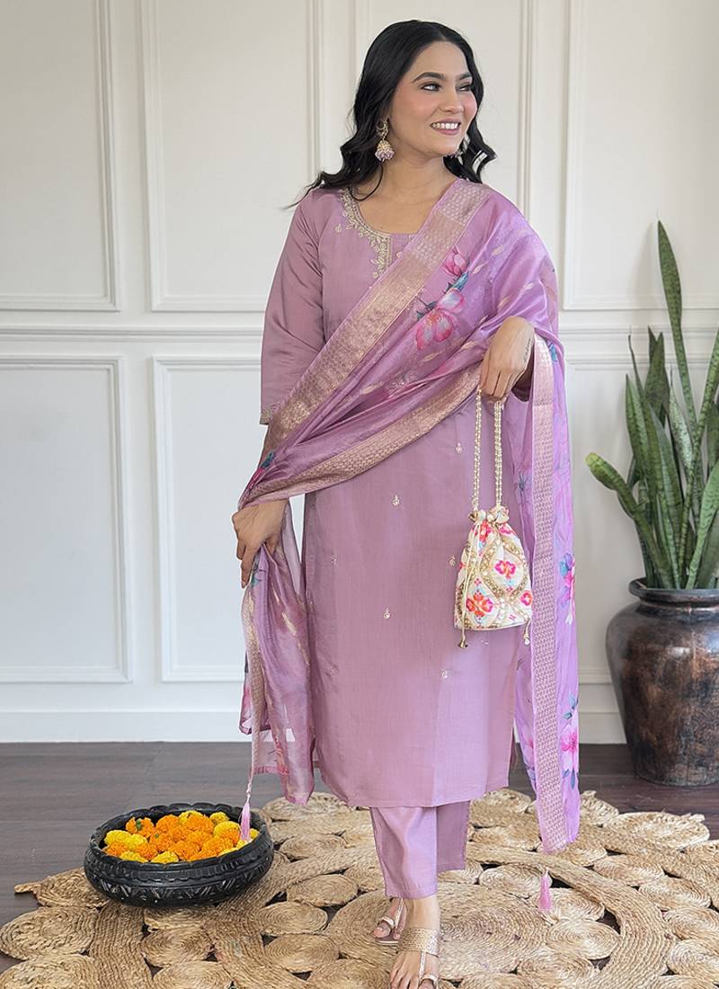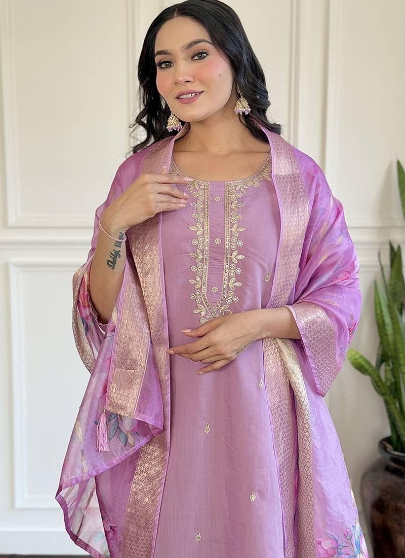 A Festive Lavender Color Chanderi Straight Suit Featuring Embroidery. Styled With 3/4th Sleeves, Round Neckline And A Drawstring Closure, Paired With Straight Pants And Dupatta.