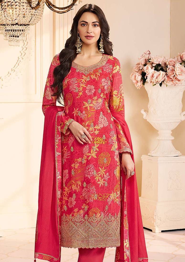 | Product Description | Crafted In Chinon Fabric This Light Red Features Minimal Digital Print Detailing. Designed With A Round Neckline, Full Sleeves, It Is Paired With Straight Fit Mid Waist Pant And A Matching Dupatta—Ideal For Festive And Pooja Occasions. |