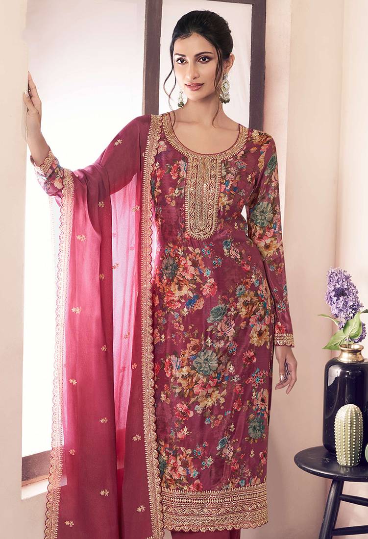 Add A Vibrant Burst Of Colour With Your Wardrobe With This Maroon Chinon Designer Salwar Kameez. Look Ravishing Clad In Such A Attire Which Is Enhanced Floral Print, Embroidered And Zari Work. Comes With Matching Bottom And Dupatta. (Slight Variation In Color, Fabric & Work Is Possible. Model Images Are Only Representative.)