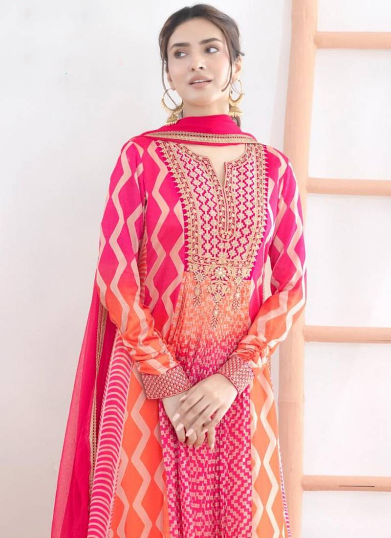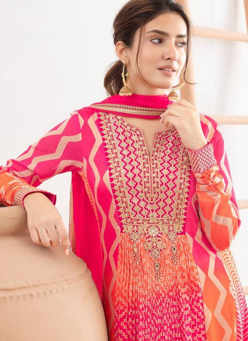 | Product Description | A Vibrant Pink And Orange Chinon Anarkali Top Set With Dabka Dori, Resham,Leheriyu Print Work, Styled With Chinon Dupatta. |