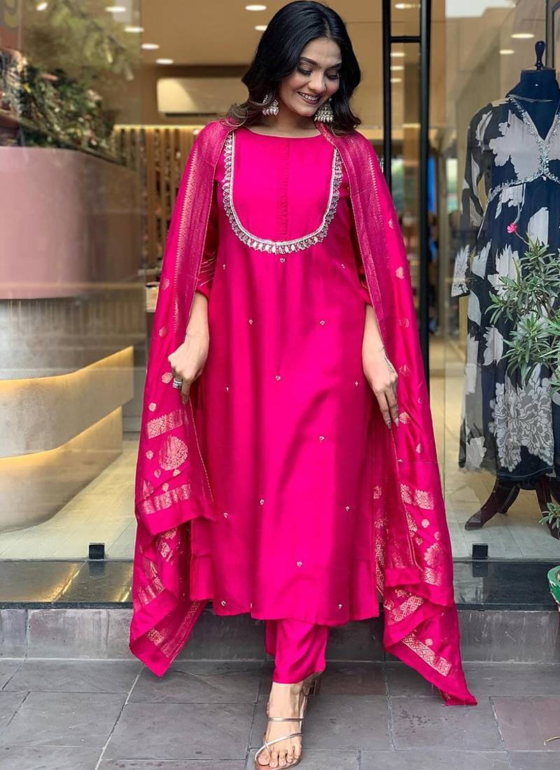 Picture Yourself In A Stunning Rani Pink Chanderi Viscose Embroidered Kurta Set, Adorned With Intricate Stone, Cut Dana, And Thread Work On The Neckline. The Accompanying Jacquard Dupatta Features A Captivating And Delicate Stonework. This Ensemble Is Perfect For Adding A Touch Of Festive Flair To Your Wardrobe