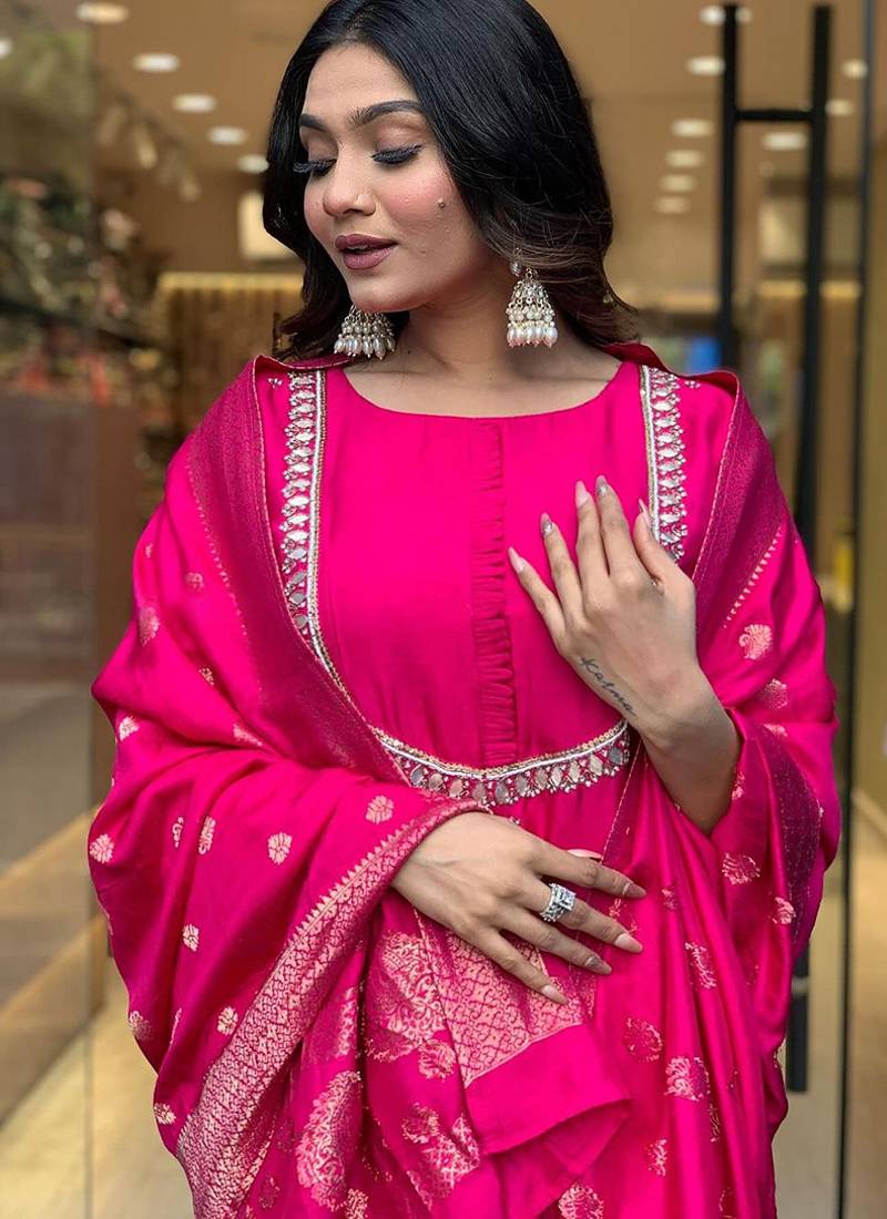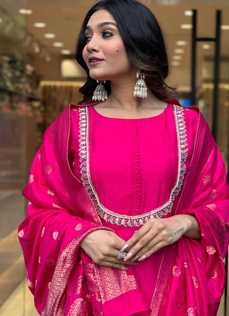 Product Name Rani Pink Color Chanderi Viscose Sttiched Kurta Set