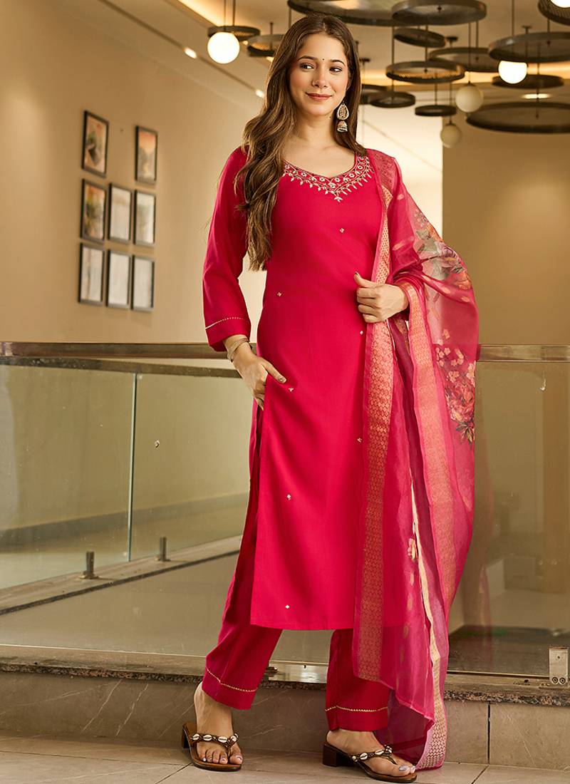 A Festive Rani Pink Color Viscose Suit Featuring Swaroski Work And Embroidery. Styled With Quarter Sleeves, Keyhole Neckline And A Drawstring Closure, Dupatta ”Ideal For Pooja And Festive Occasions