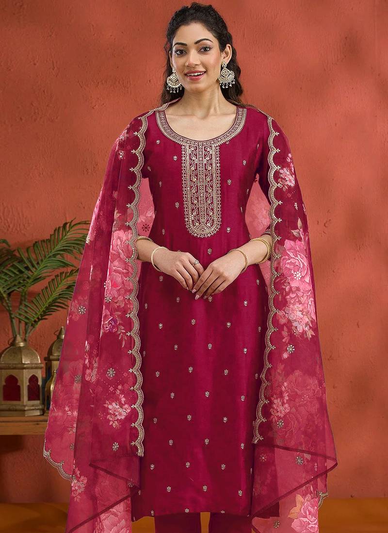 Rani pink vichitra silk embroidered semi sttiched kurta set semi stitched