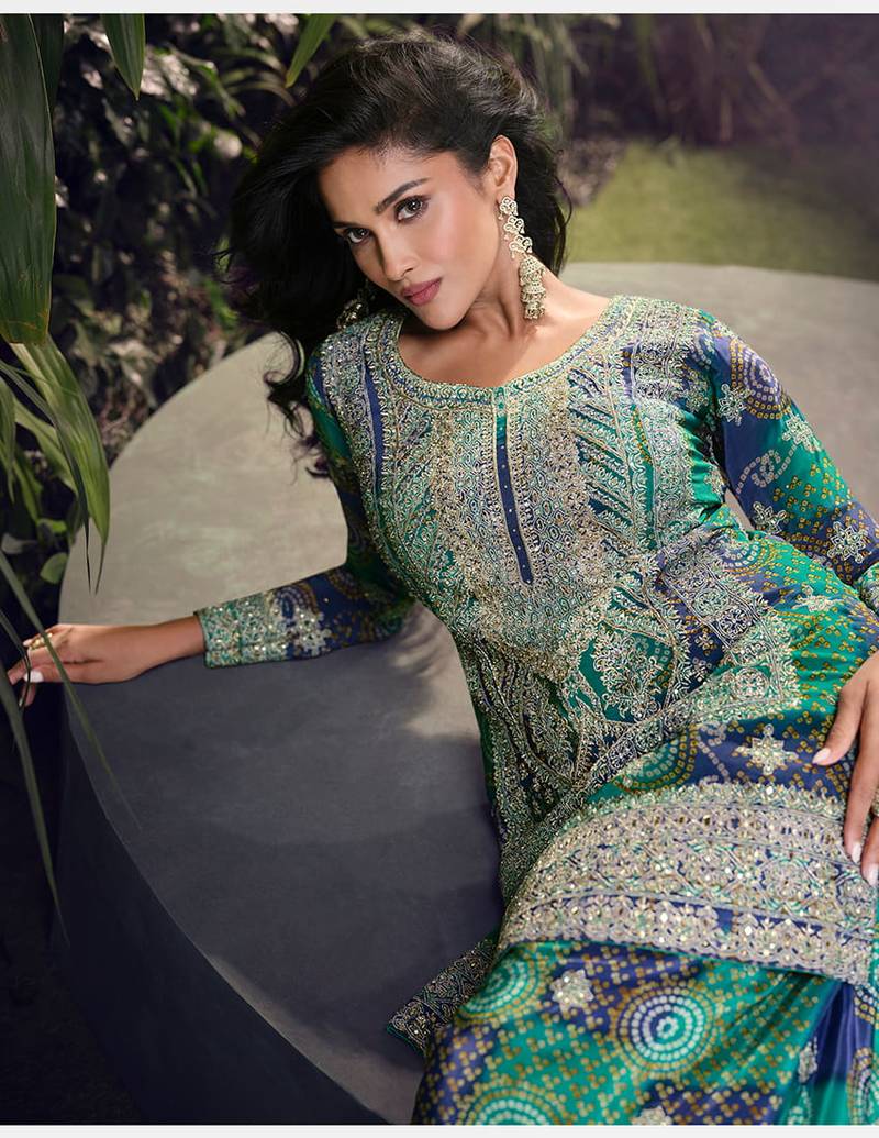 Teal and blue chinon silk embroidered palazzo suit semi stitched