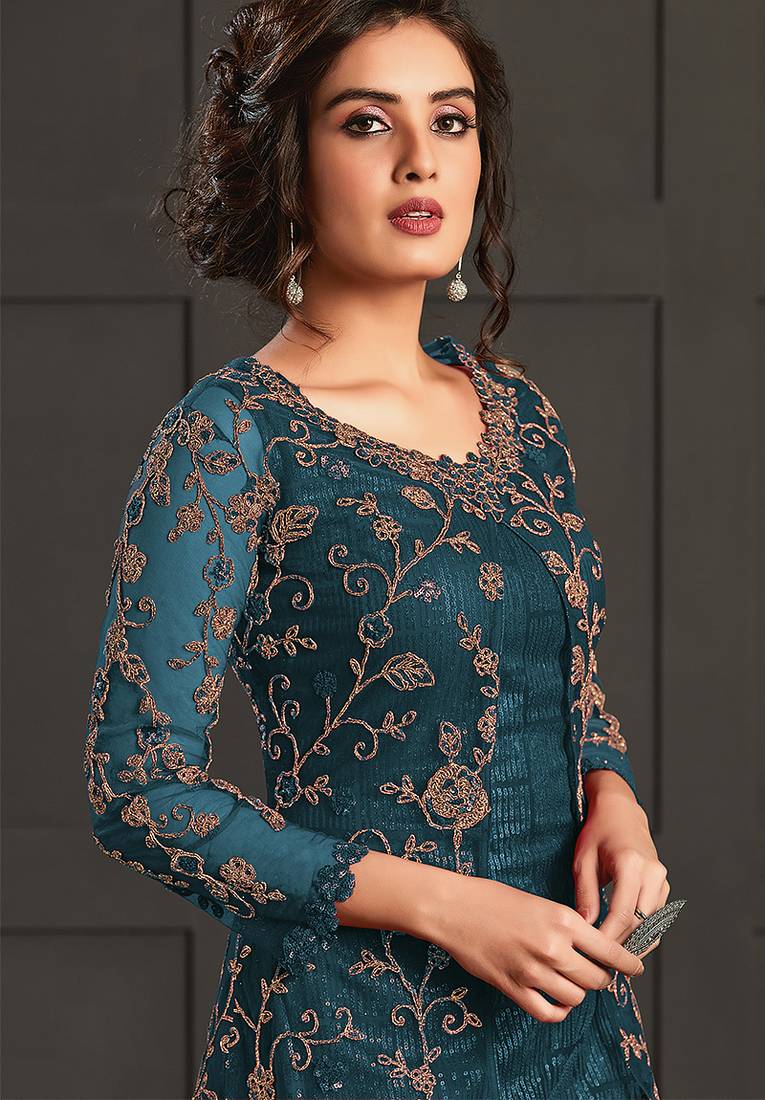 | Product Name | Teal Net Embroidered Sequin Work Suit With Shrug | |