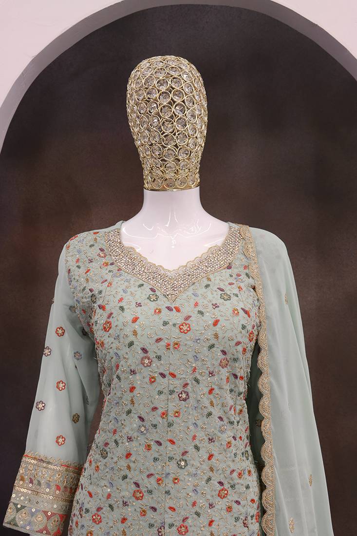 Sky blue thread georgette palazzo salwar suit semi stitched